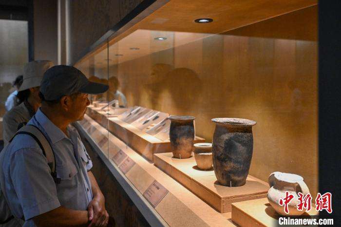 参观者观看展品“折沿平底陶罐”。(图片来源:中新网)