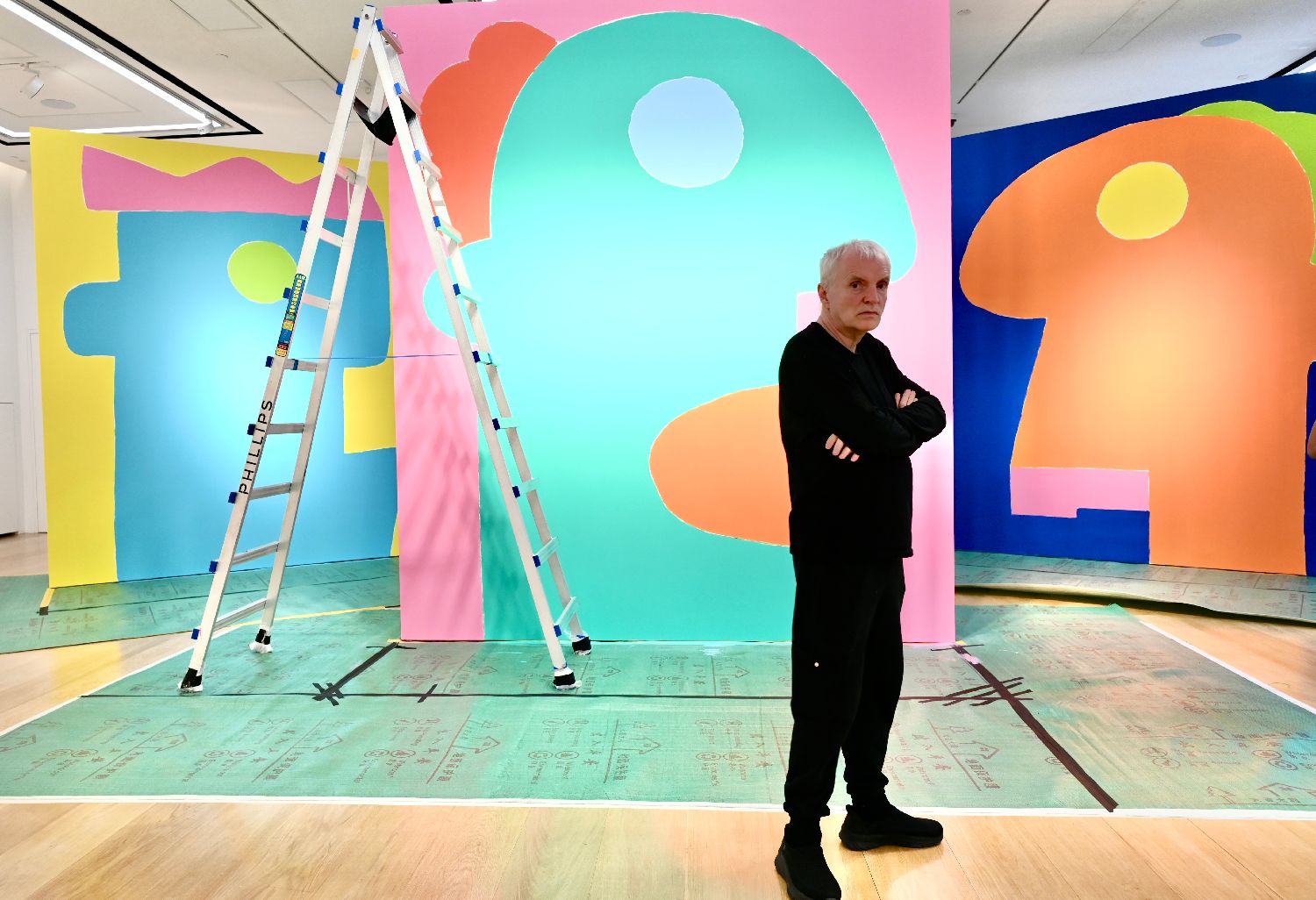 该展览是法国当代艺术家蒂埃里·诺尔(ThierryNoir)的个人展览,数十幅艺术作品展示他的艺术视野与活力。图为蒂埃里·诺尔与他在香港办展期间创作的艺术作品。(图片来源:本文图片均自中新社)