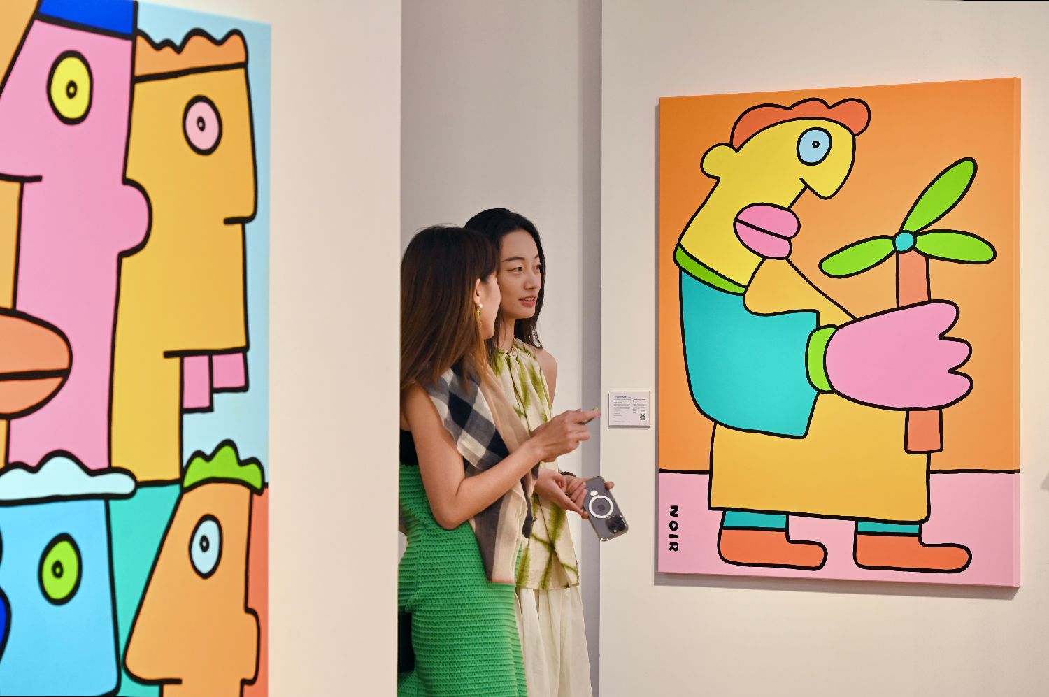 7月15日,“蒂埃里·诺尔:尖峰时刻”展览在香港西九文化区的富艺斯亚洲总部展出。图为两名女士参观展览。