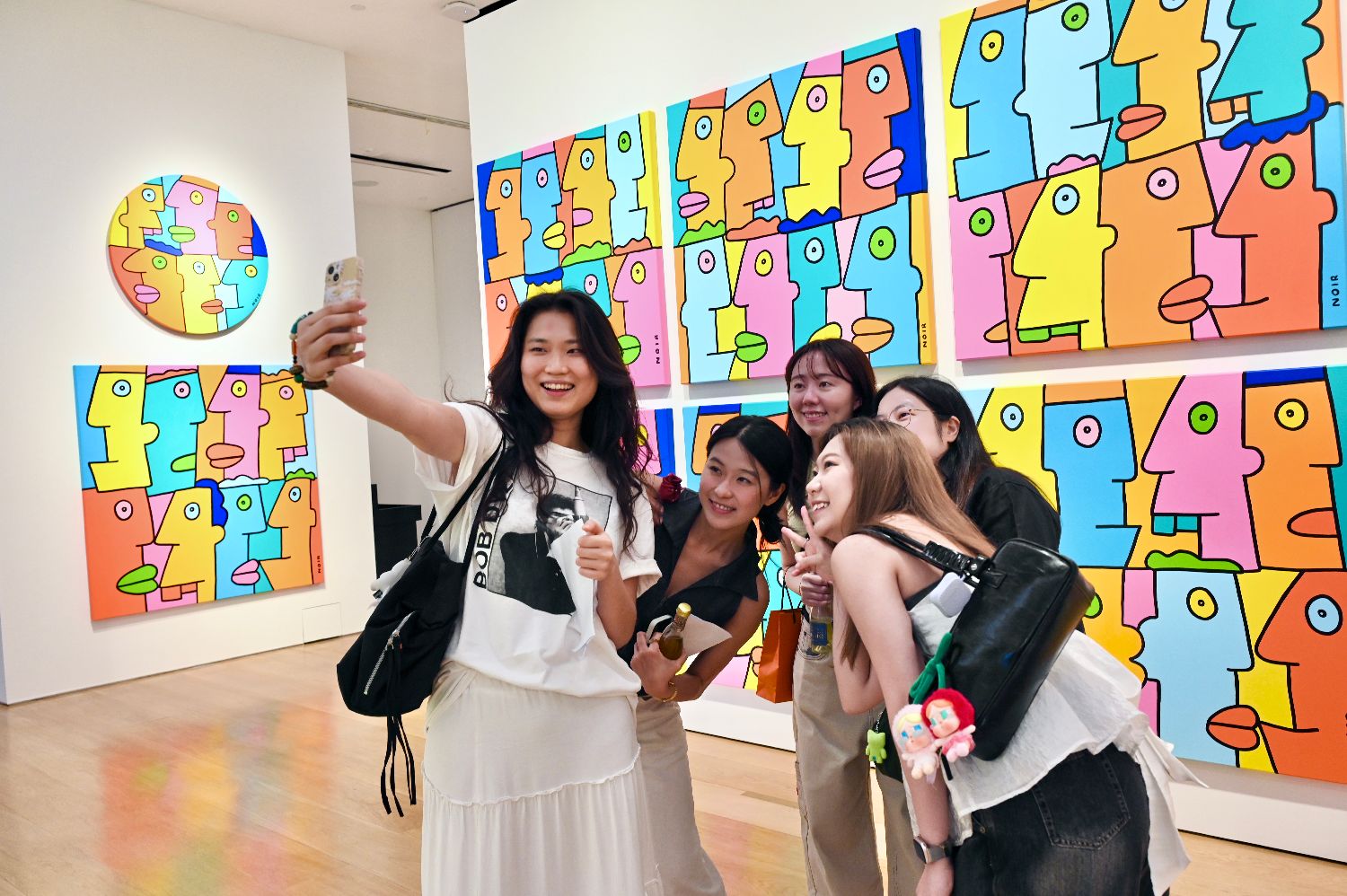 该展览是法国当代艺术家蒂埃里·诺尔(ThierryNoir)的个人展览,数十幅艺术作品展示他的艺术视野与活力。图为现场人士与艺术作品自拍。