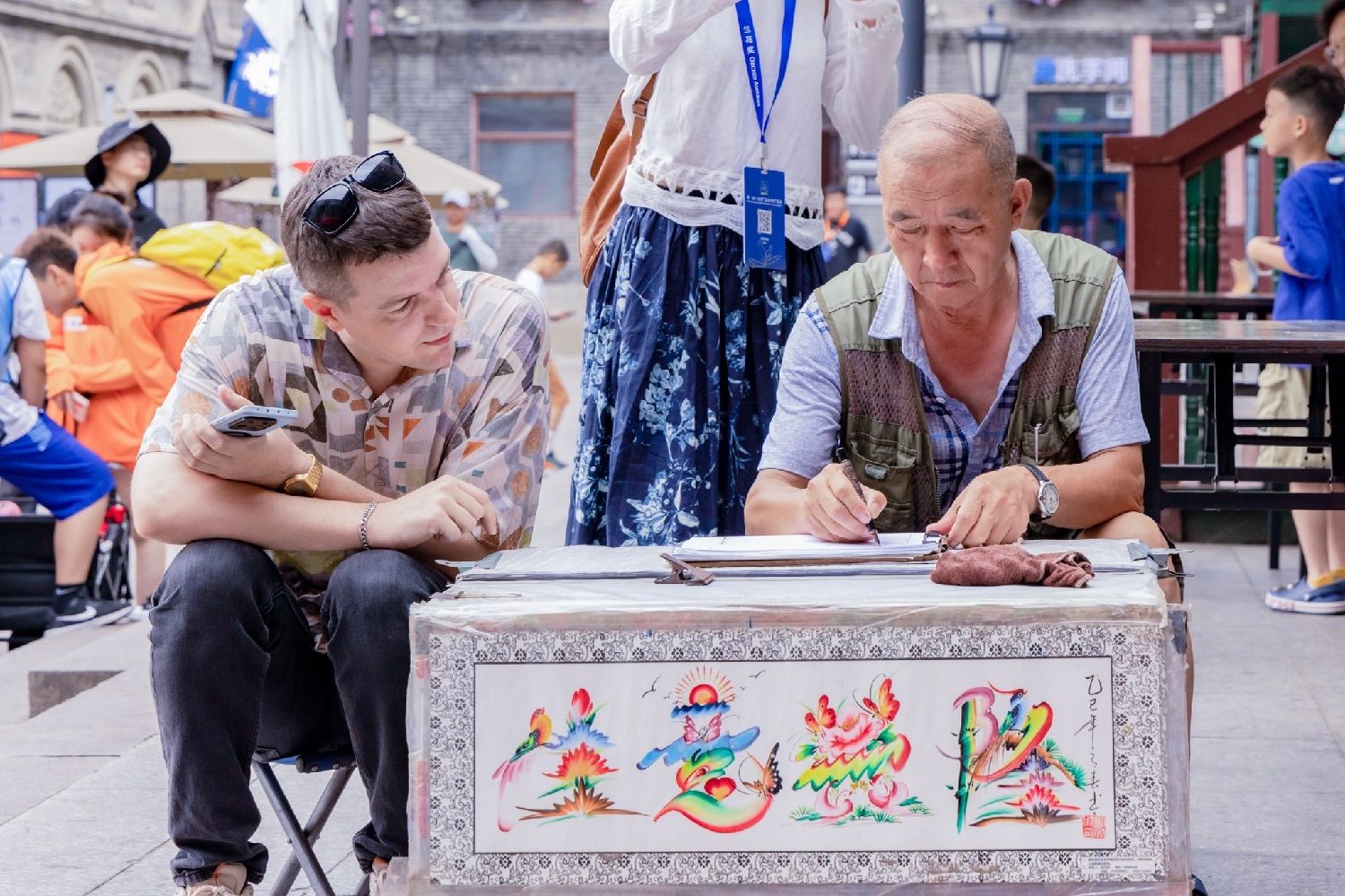 7月12日,参与活动的外籍友好人士(左)在哈尔滨中华巴洛克历史文化街区了解中国传统技艺。