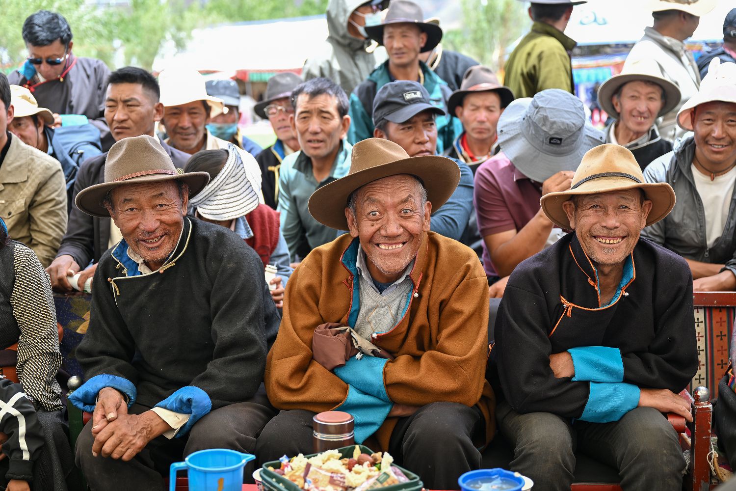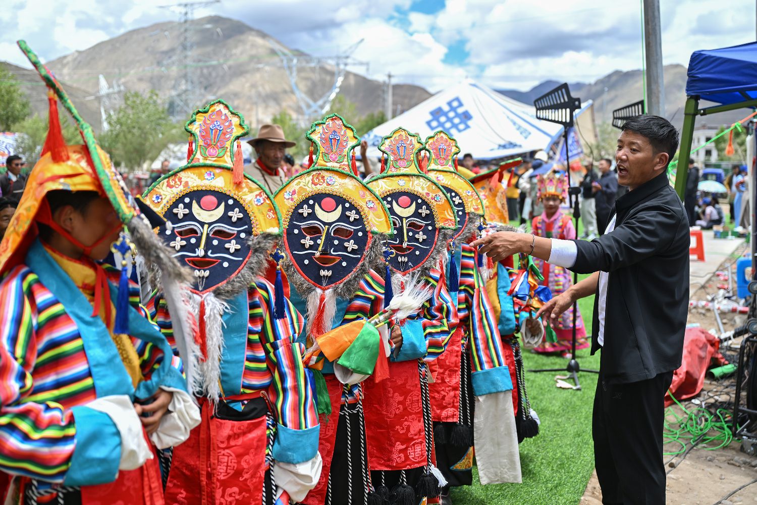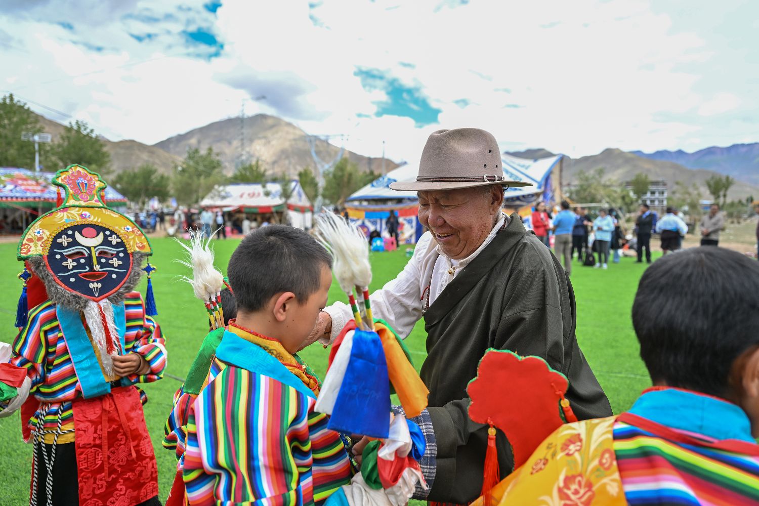 图为7月16日,76岁的湘巴藏戏中国国家级非遗传承人次仁多吉(右二)在南木林县非遗公园内给即将表演湘巴藏戏的小演员整理服装。