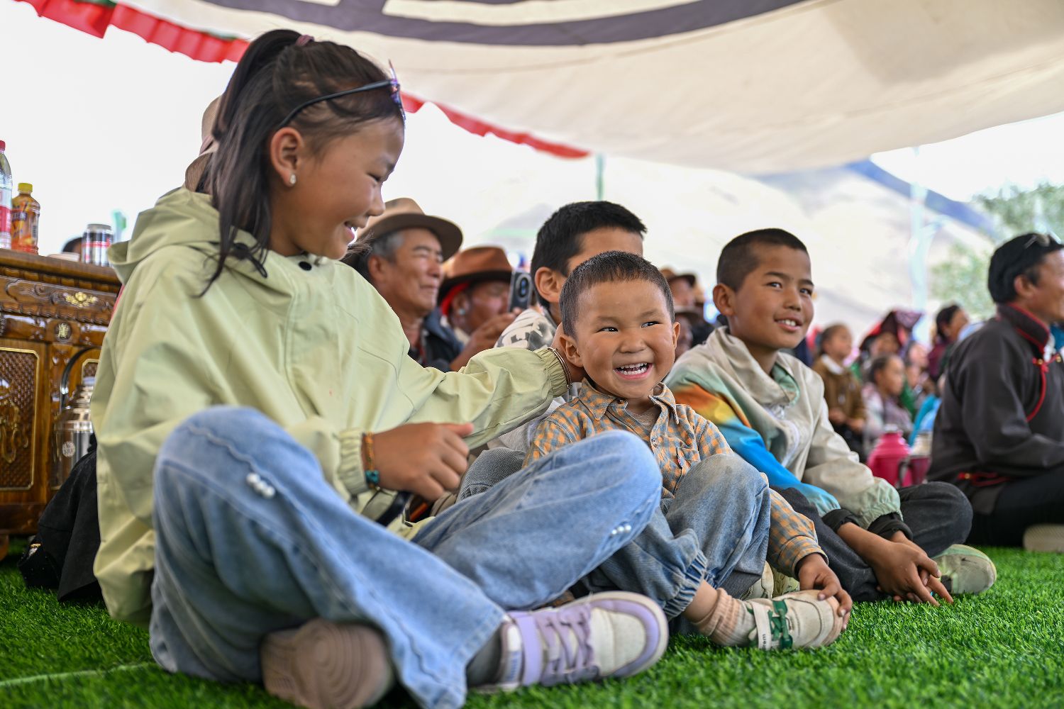 目前,全县共有29支民间藏戏队,876名藏戏从业者,还有1支32名少儿组成的平均年龄9岁的少儿藏戏队。图为7月16日,果拉村少儿藏戏队的领队老师旦增(右一)提醒即将上台表演的小演员整理服装。