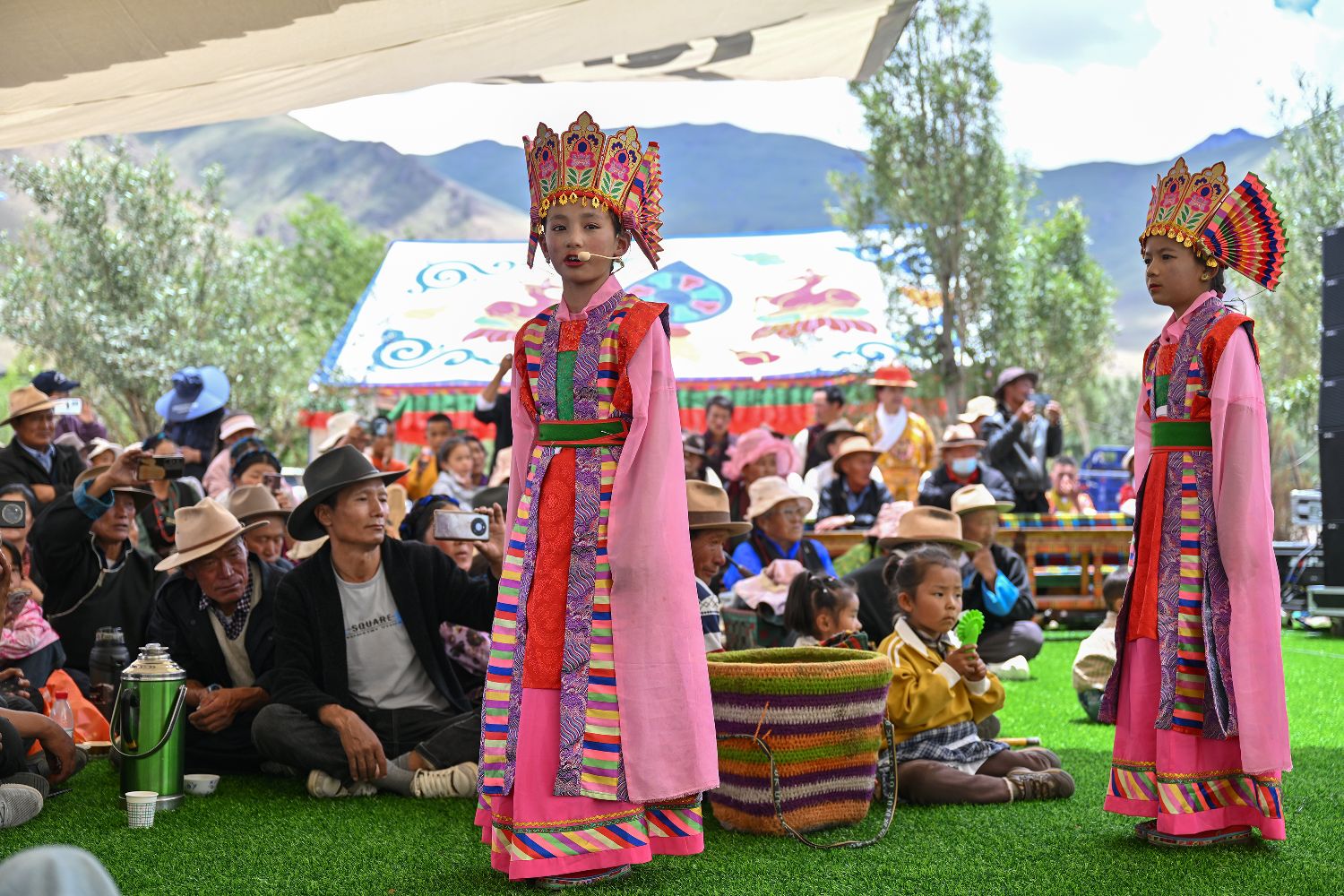 一代代藏戏表演者在表演实践中传承创新,让古老藏戏艺术不断焕发新的光彩。图为7月16日,果拉村少儿藏戏队的7岁小演员普琼次仁(前)在表演湘巴藏戏。