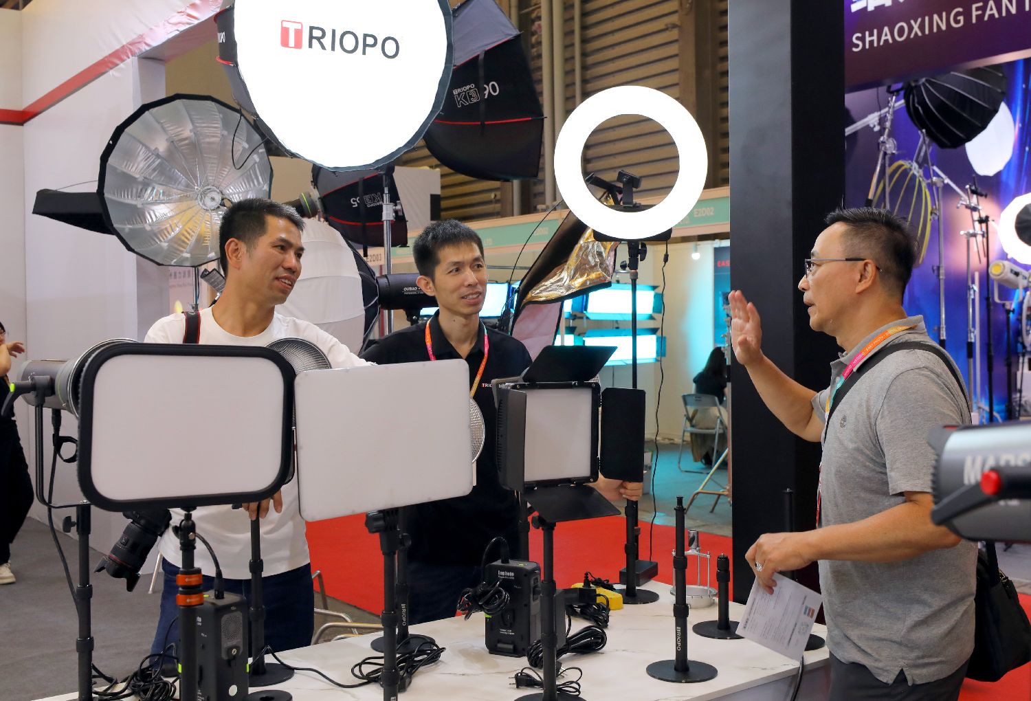 7月17日,参观者在一组摄影灯具展品前交流讨论。