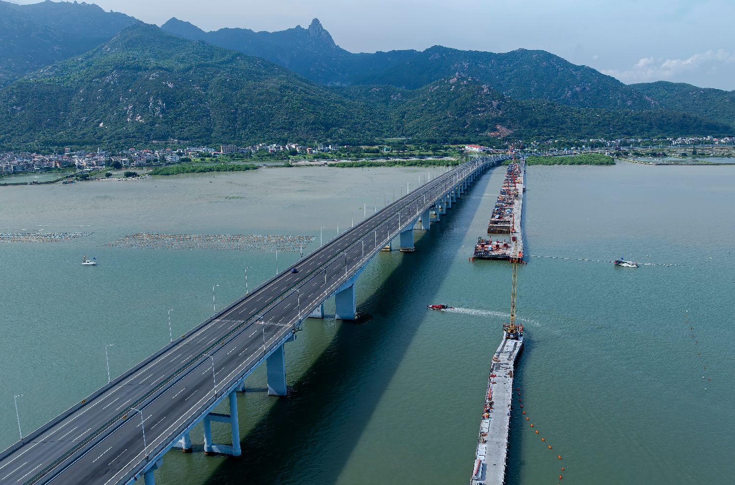 漳汕高铁全线建成通车后,将与福厦高铁、广汕高铁等共同组成沿海大通道,进一步完善区域路网结构,助力中国东部沿海地区高质量发展。图为漳江湾跨海特大桥施工现场(7月16日摄,无人机照片)。