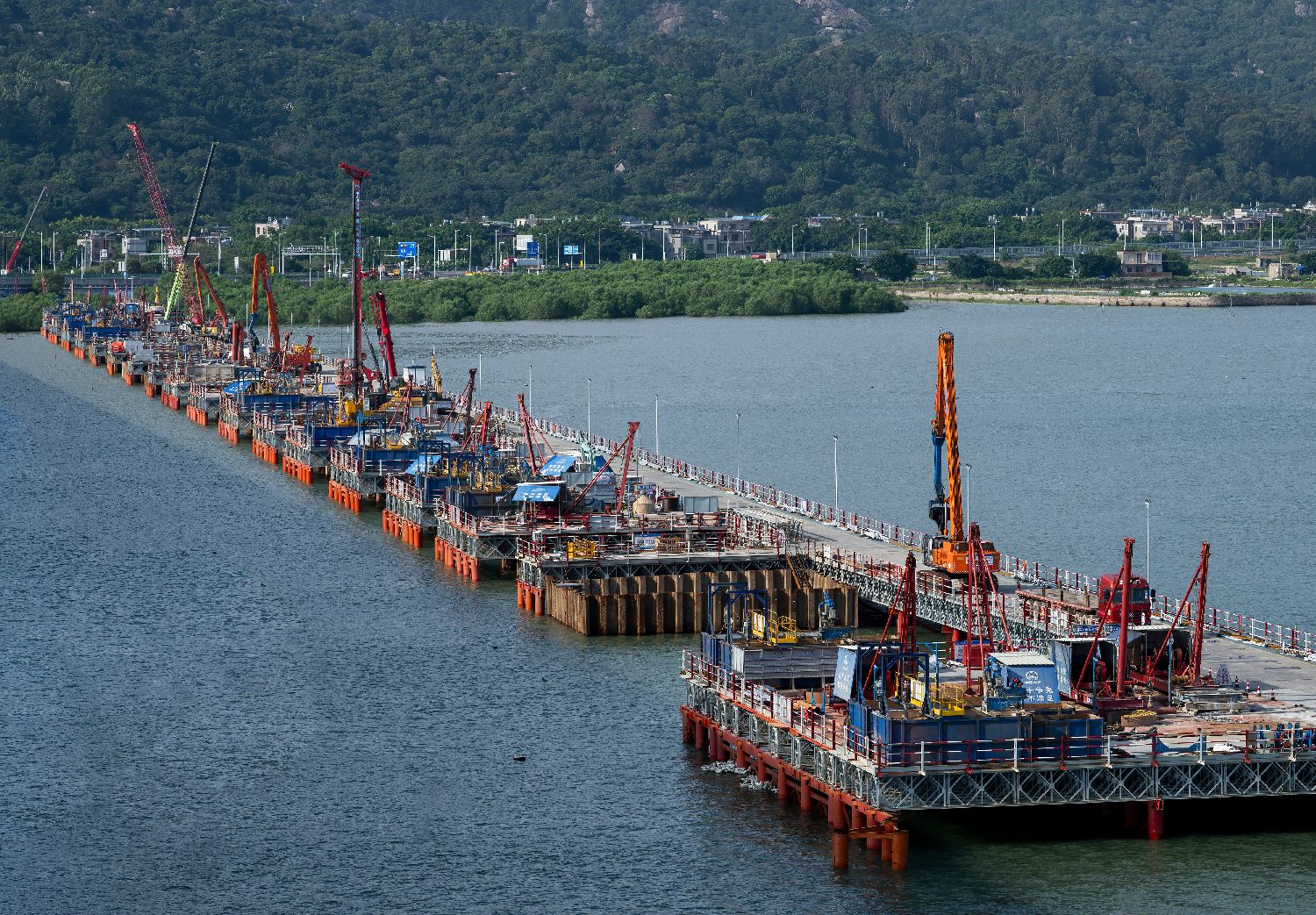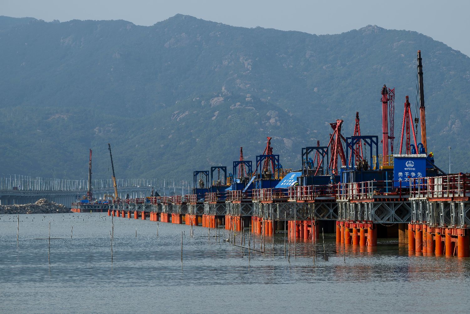 图为漳江湾跨海特大桥主栈桥桩基施工现场(7月16日摄)。