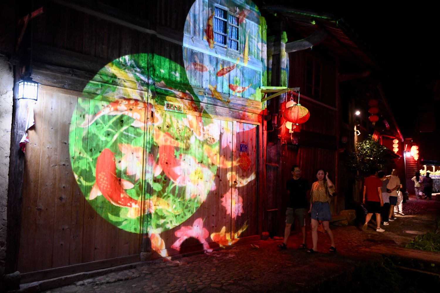 7月17日晚,鲤鱼灯光秀在古厝上演。位于福建省周宁县的鲤鱼溪源自宋代,距今已有八百多年历史,鲤鱼在村民的保护下繁衍至今。(图片来源:中新社)
