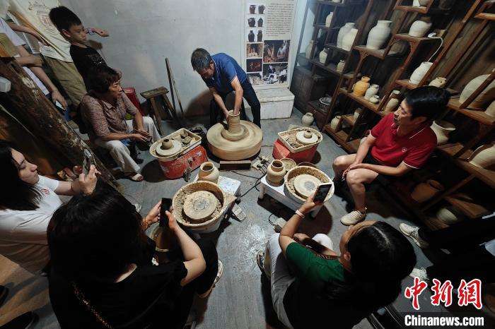 7月17日晚,鲤鱼溪风景区的传统手工制硋技艺吸引游人围观。(图片来源:中新网)