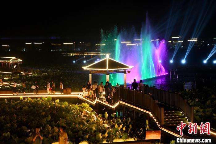 7月17日晚,游客观看鲤鱼溪风景区水幕灯光秀。(图片来源:中新网)
