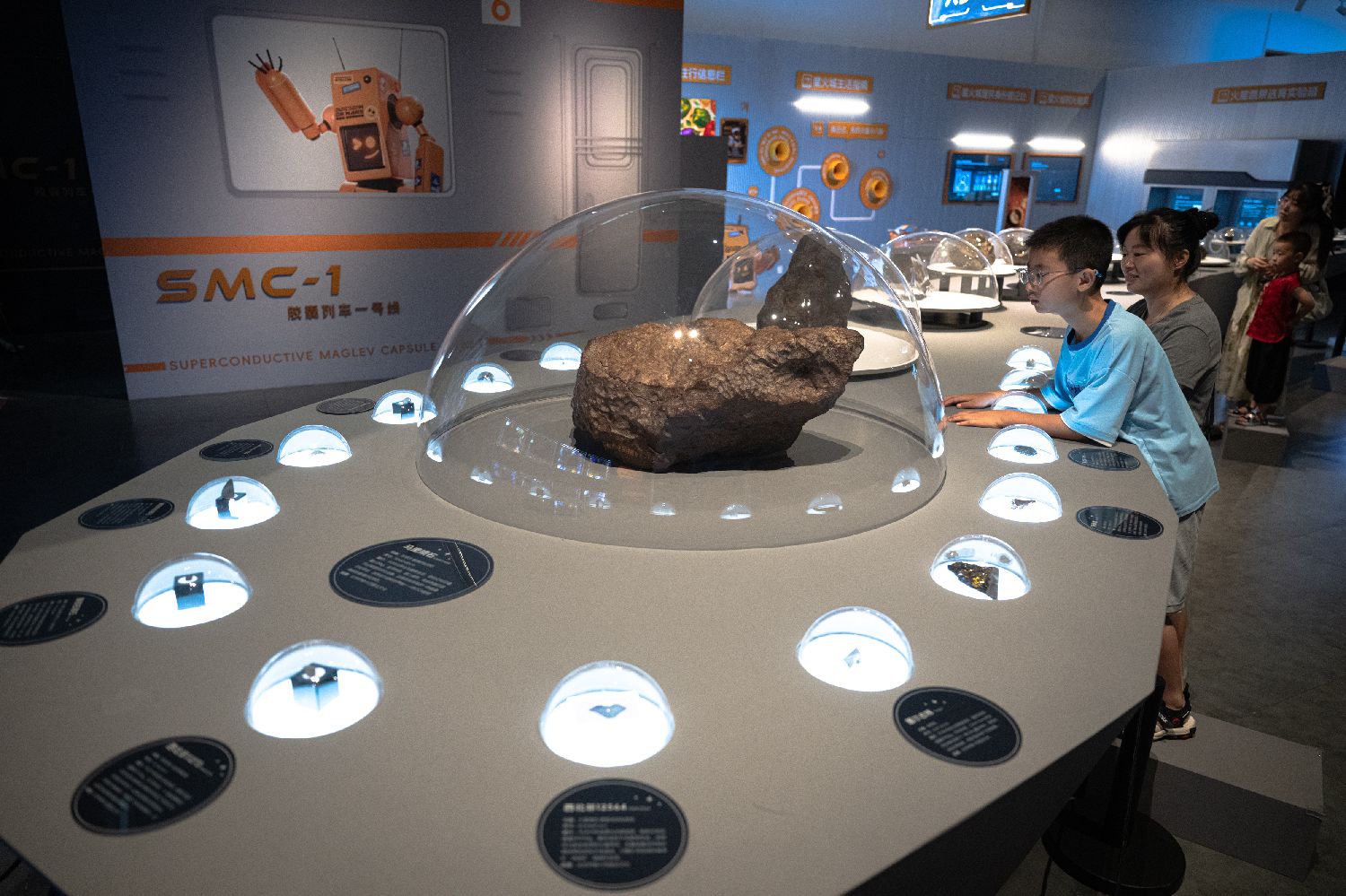 7月18日,小朋友在“走!去建设火星”硬科幻行星科学体验展上观看展出的火星陨石。