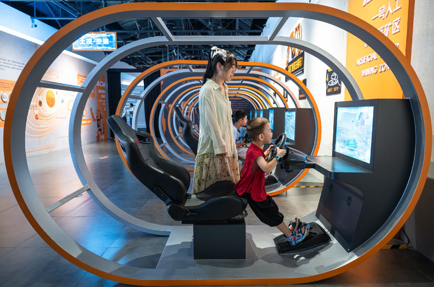 7月18日,小朋友在“走!去建设火星”硬科幻行星科学体验展上体验模拟火星工程车。