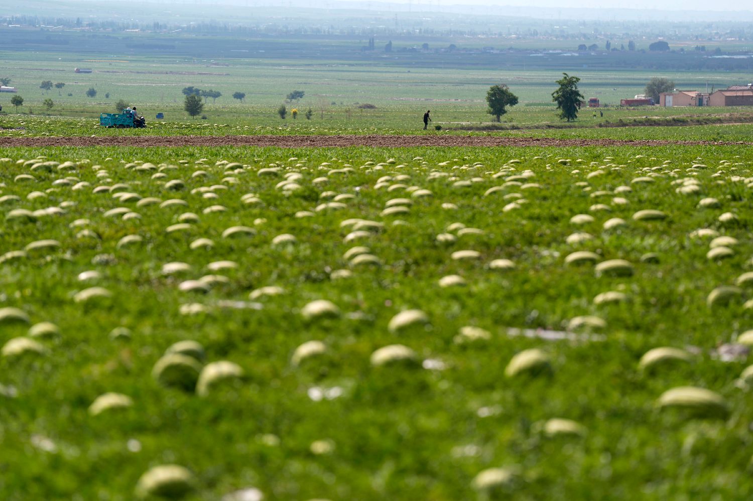 7月20日,农户在中卫市沙坡头区香山乡硒砂瓜田里劳作。