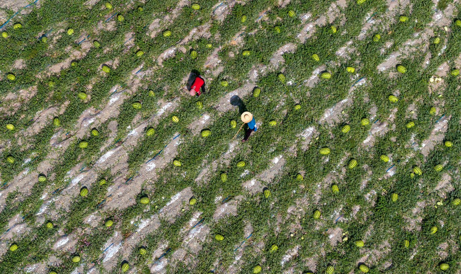 7月20日,农户在中卫市沙坡头区香山乡硒砂瓜田里劳作(无人机照片)。