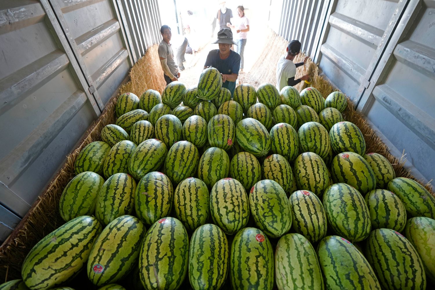 7月20日,客商在中卫市沙坡头区兴仁镇将硒砂瓜装车。