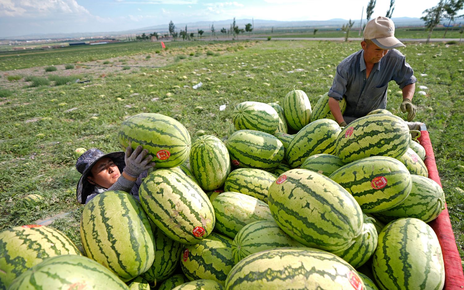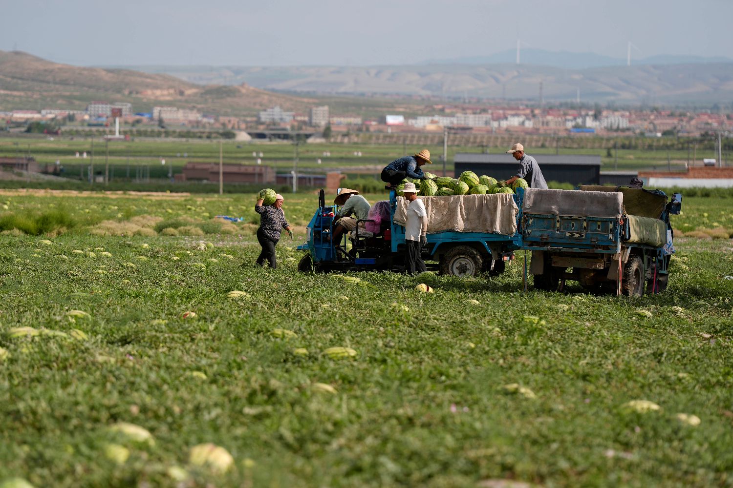 7月20日,农户在中卫市沙坡头区兴仁镇硒砂瓜田里劳作。(图片来源:本文图片均据新华社)