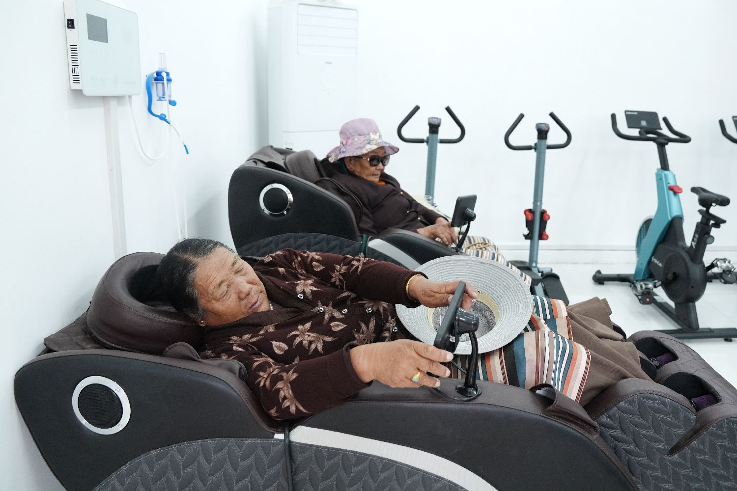 在活动室,78岁的白玛躺在按摩椅中享受按摩服务。她告诉记者,儿子平日在外上班,她的一日三餐都在驿站。娱乐休闲之余,她对按摩椅很感兴趣,每天都用1个小时疏通筋骨。和记者交流时一次按摩结束,白玛熟练地在操作屏上再次按下启动按钮。