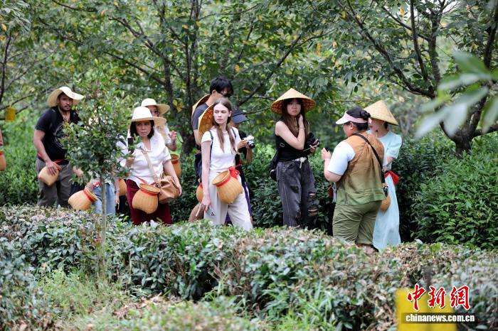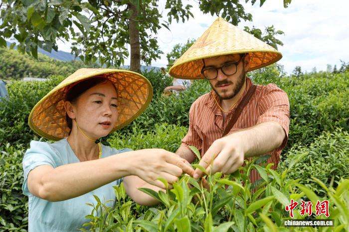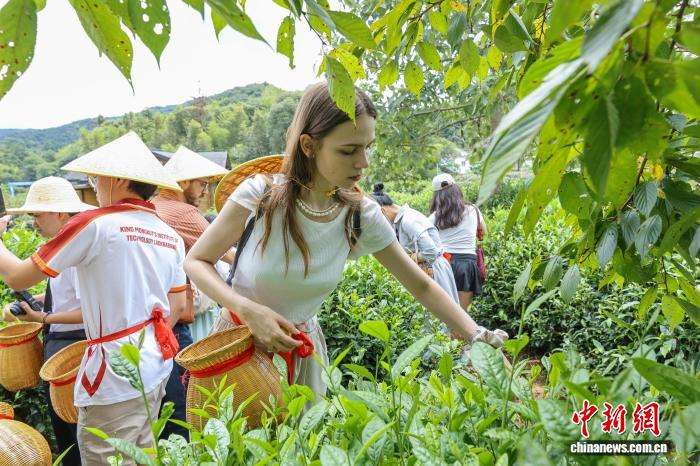 学生们深入茶园亲手采摘鲜叶,在制茶师傅指导下体验揉捻、抖筛等传统工序,近距离感受中国国家级非物质文化遗产——祁门红茶制作技艺的独特魅力。图为外籍学生体验采茶。(图片来源:本文图片均来自中新网)