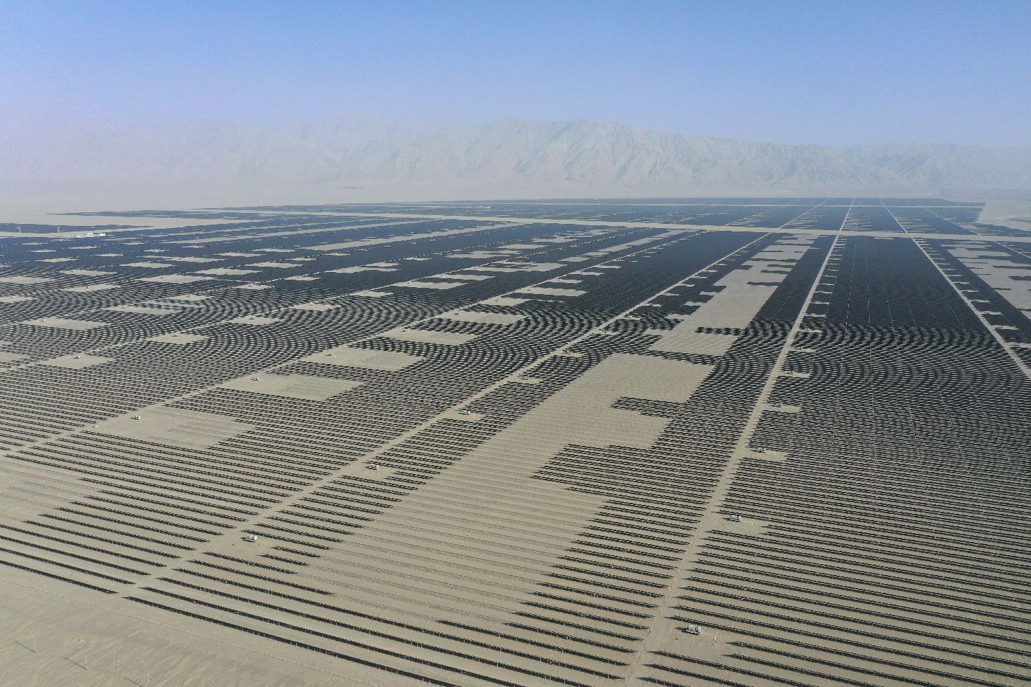 总长4197公里的环塔里木盆地750千伏输变电工程近日全线贯通,至此,电网同铁路、公路、机场、环塔克拉玛干绿色阻沙防护带工程形成的“五环”,将南疆这一曾经的集中连片特困地区的基础设施短板不断补齐,助力南疆迈上兴业富民的发展“快车道”。图为2025年6月26日拍摄的中国绿发新疆中绿电若羌400万千瓦光伏项目。(图片来源:本文图片均自新华社)
