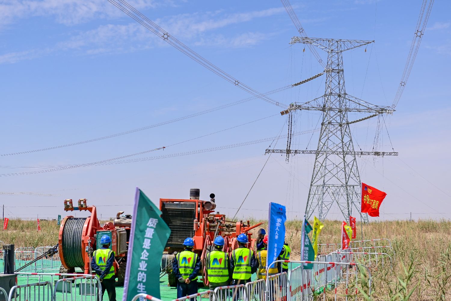 随着以“五环”为代表的基础设施建设不断完善,近年来南疆经济社会发展呈现新活力,2021年至2024年地区生产总值由4817亿元增长至6128亿元人民币,增长了27.2%。图为7月13日,施工人员在新疆和田地区民丰县架设民丰—且末750千伏线路最后一段电线。