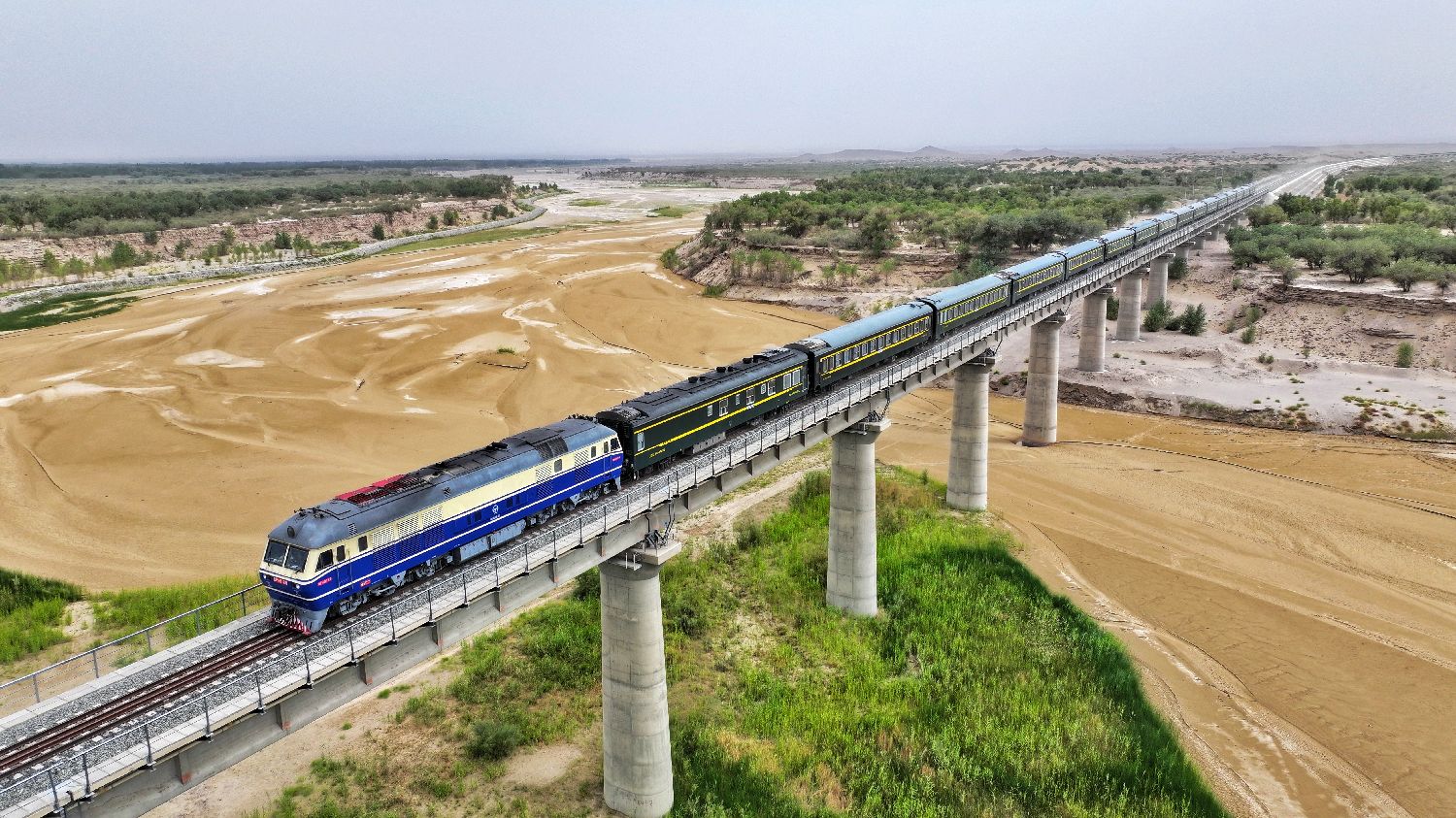 历时15年建设,环塔里木盆地750千伏输变电工程终于全线贯通,中国最大的盆地——塔里木盆地装上了电力“能量环”。图为7月8日,5818次旅客列车驶过和若铁路其其干河特大桥。