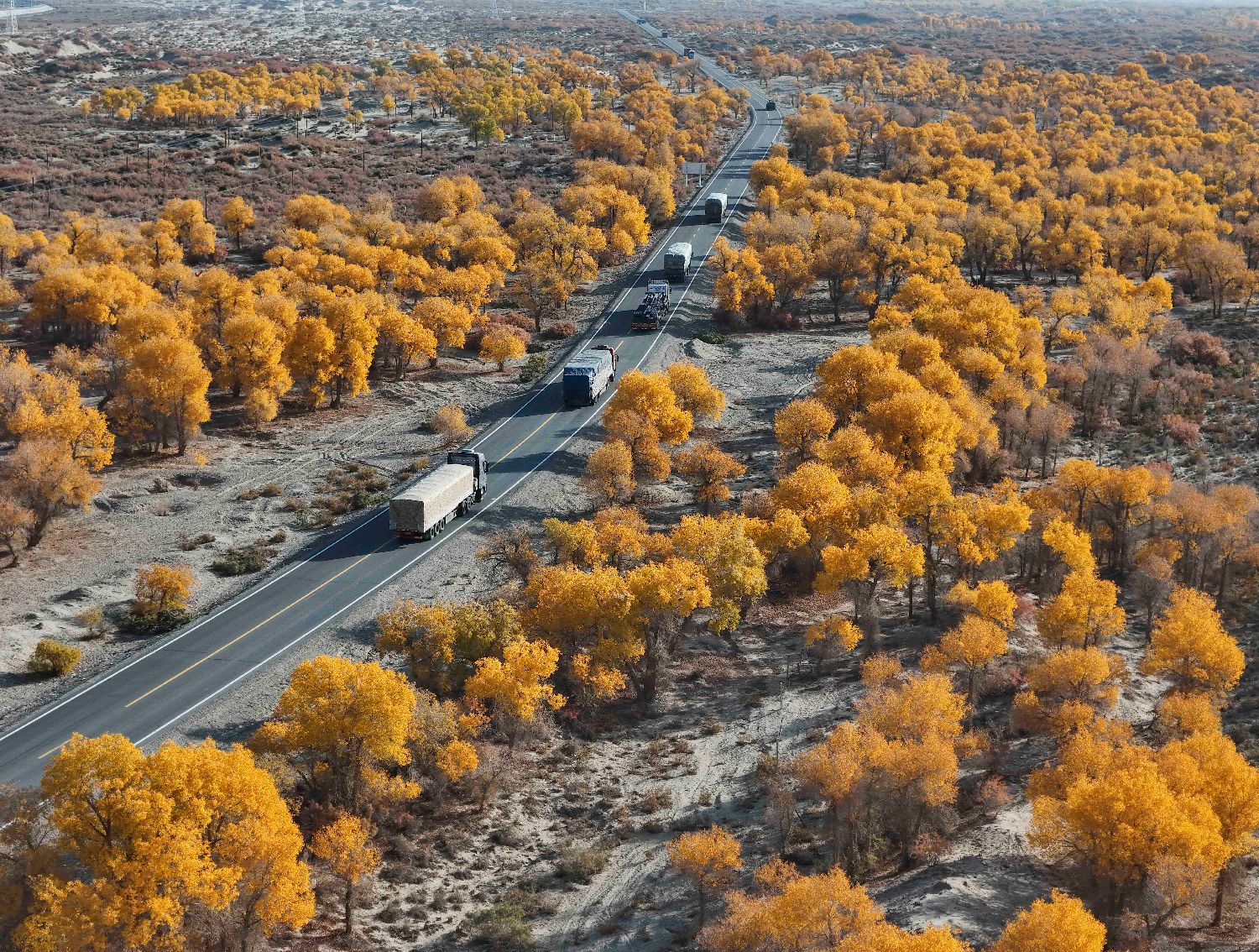 这条目前中国最大的750千伏超高压输电环网,是中国在塔克拉玛干沙漠周边,继铁路、公路等之后完成的又一项基建大工程。图为车辆行驶在新疆巴音郭楞蒙古自治州境内的公路上。