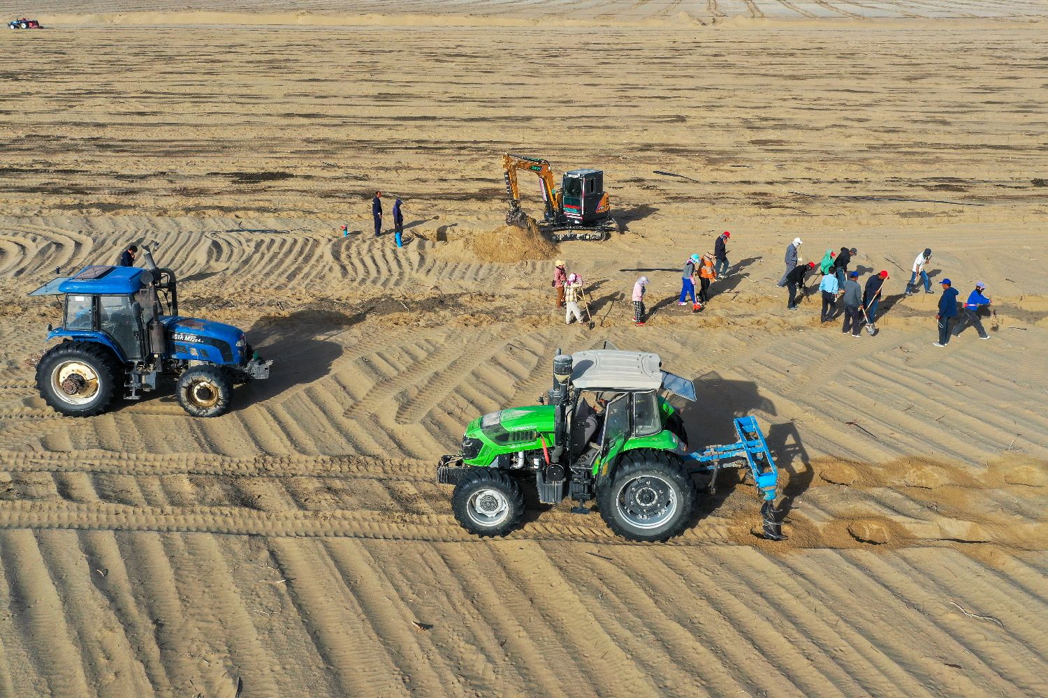 环绕塔里木盆地,新型电力系统、油气生产加工、绿色矿业及加工、绿色畜牧产品和优质果蔬、文化和旅游等十大产业集群发展气势如虹,合力构建南疆现代化产业体系。图为工作人员在新疆巴音郭楞蒙古自治州且末县唐农万物(且末)生态科技试验基地种植苗木。