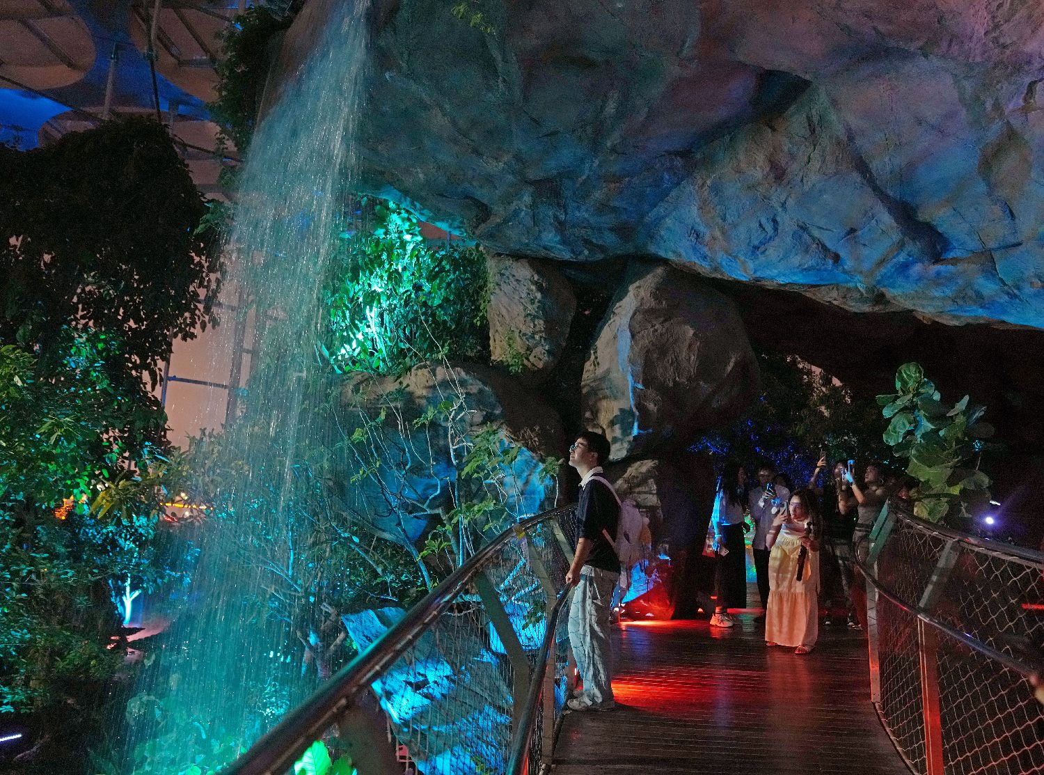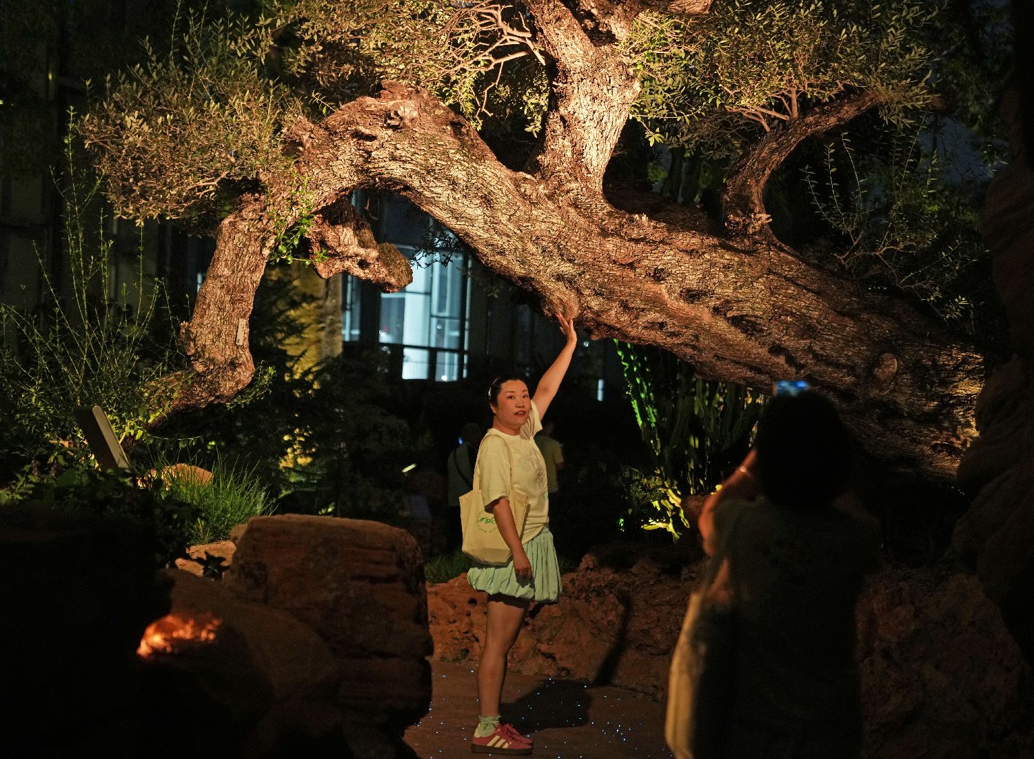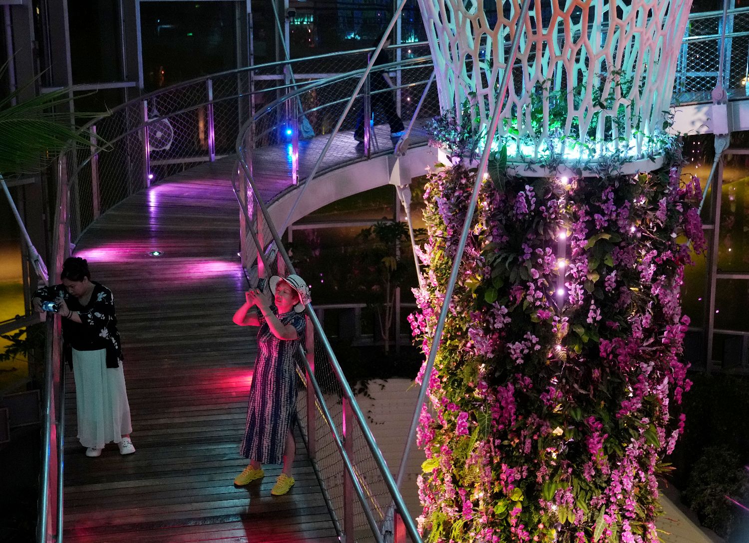 7月21日晚,夜游温室花园(测试场)的游客在拍照。