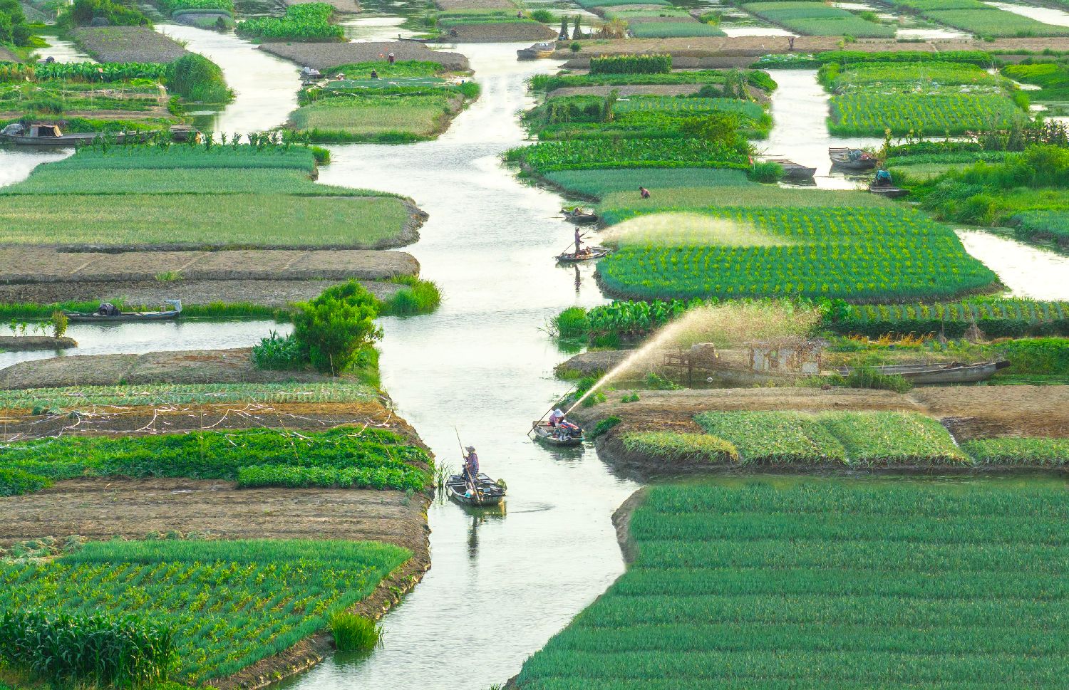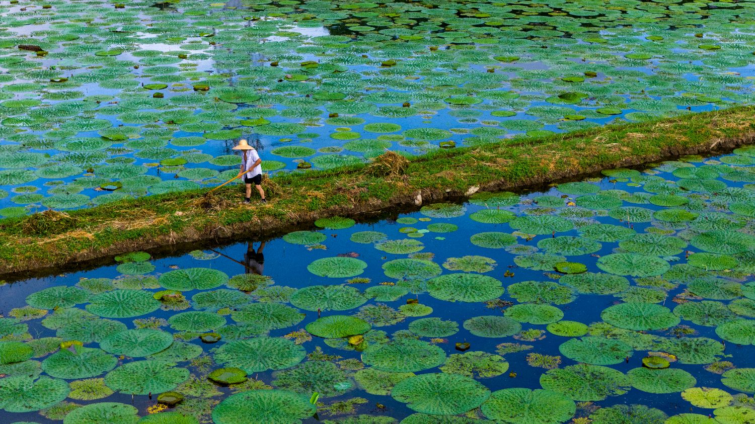 7月22日,农民在江苏省兴化市垛田街道高家荡村的田间劳作(无人机照片)。当日是大暑节气,各地农民抢抓农时,忙碌在田间地头。(图片来源:本文图片均自新华社)