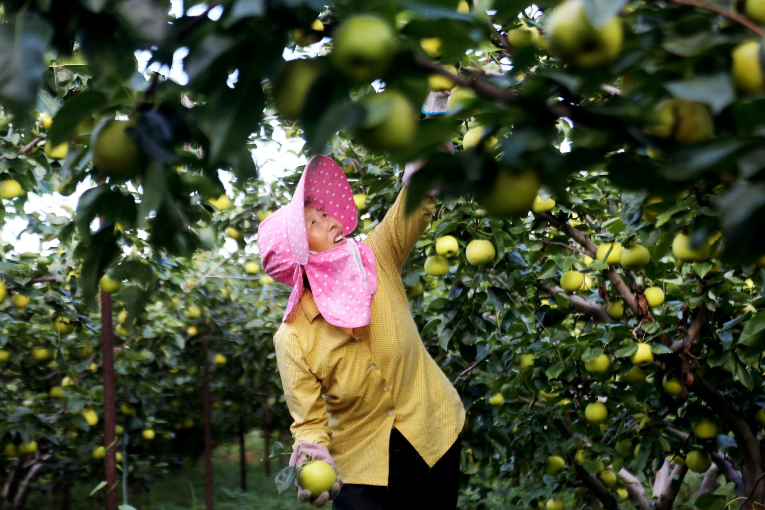 7月22日,农户在江苏省连云港市连云区云山街道李庄村摘梨。