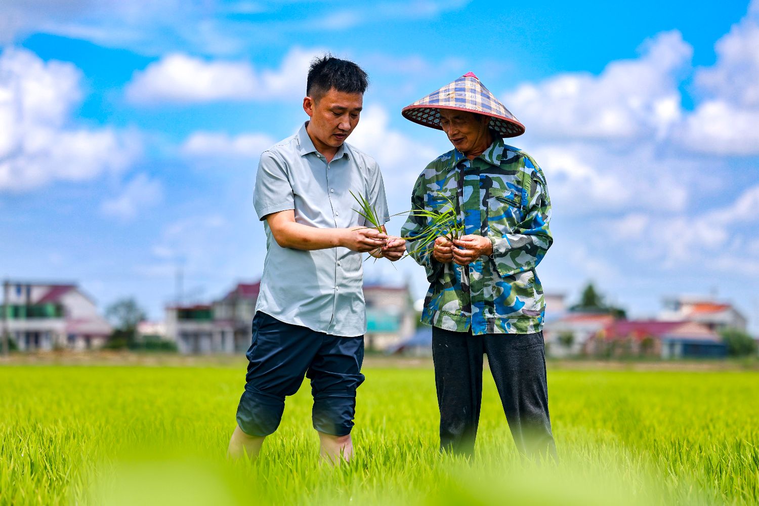 7月22日,农技人员和农民在江苏省南通市通州区东社镇严北村的田间查看水稻生长情况。