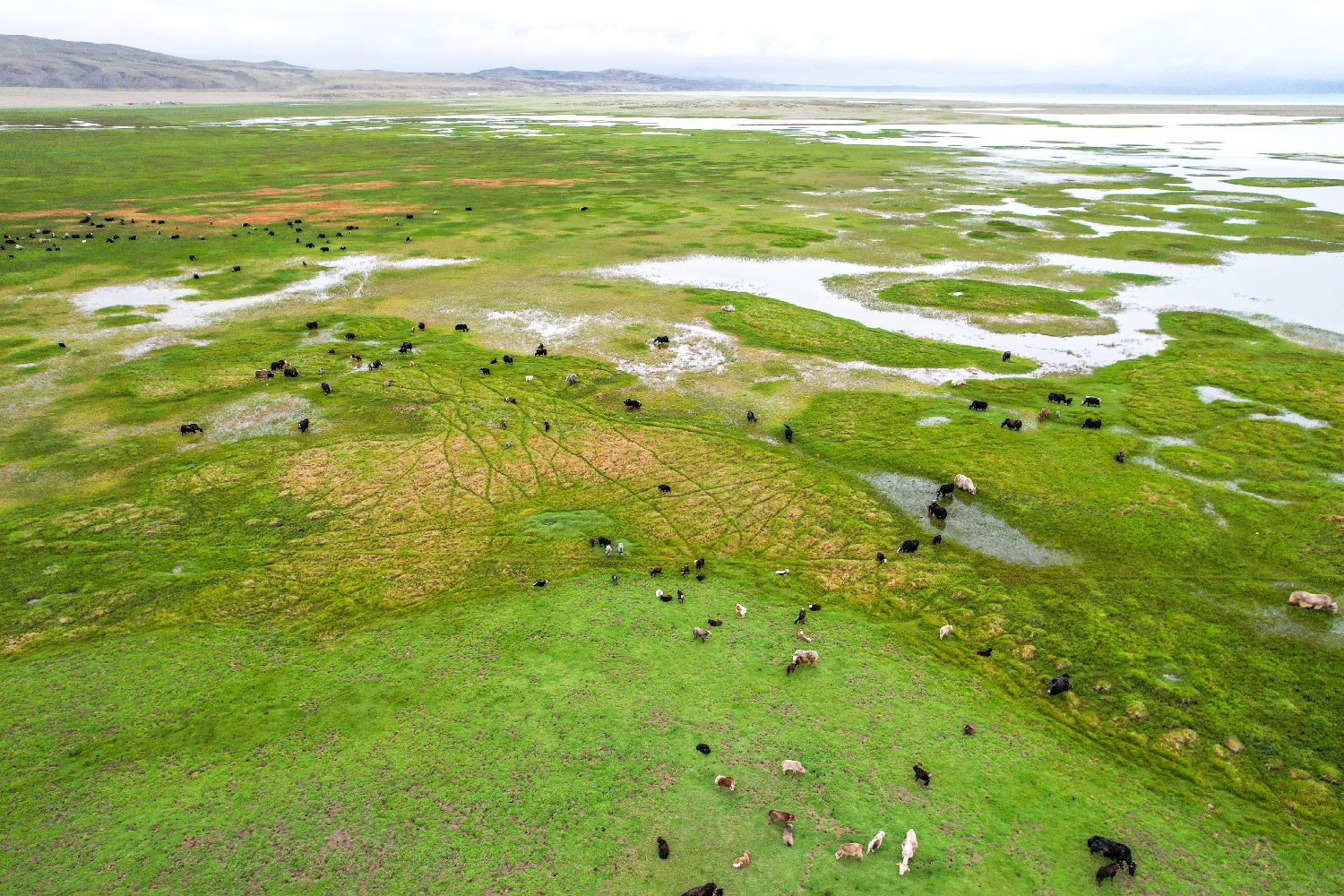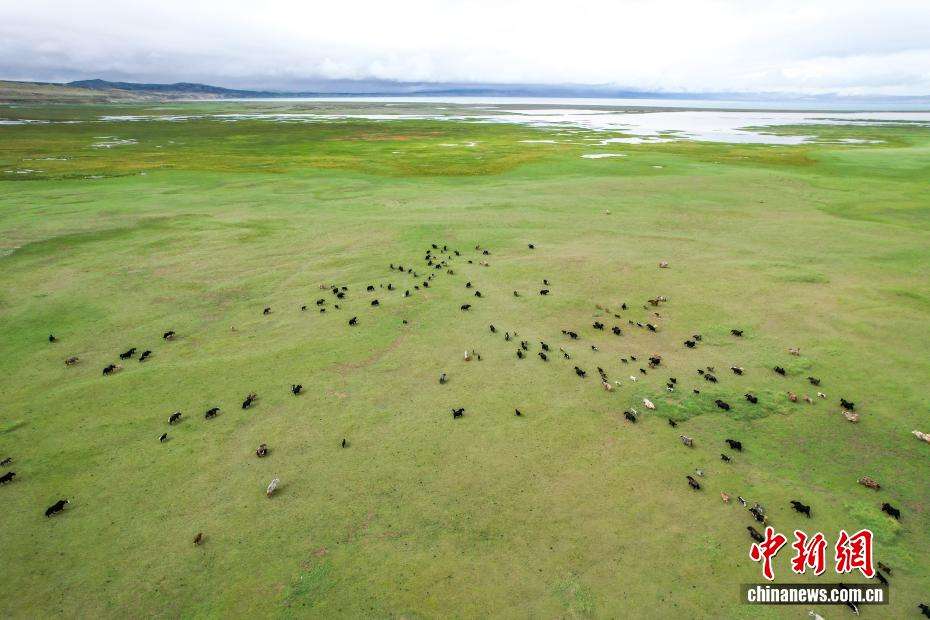 7月22日,在西藏阿里地区普兰县霍尔乡,牧民在玛旁雍错湿地上放牧牦牛。为实现更大的经济效益,霍尔乡近年来探索建立牦牛养殖专业合作社,按当地自然条件合理分配牦牛放牧地点,并将牛奶进行加工销售,2023年该合作社的年总收入达到60余万元人民币,带动牧民人均增收2万余元人民币。(图片来源:中新社)