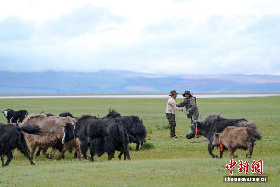 7月22日,牧民在玛旁雍错湿地上放牧牦牛。(图片来源:中新网)