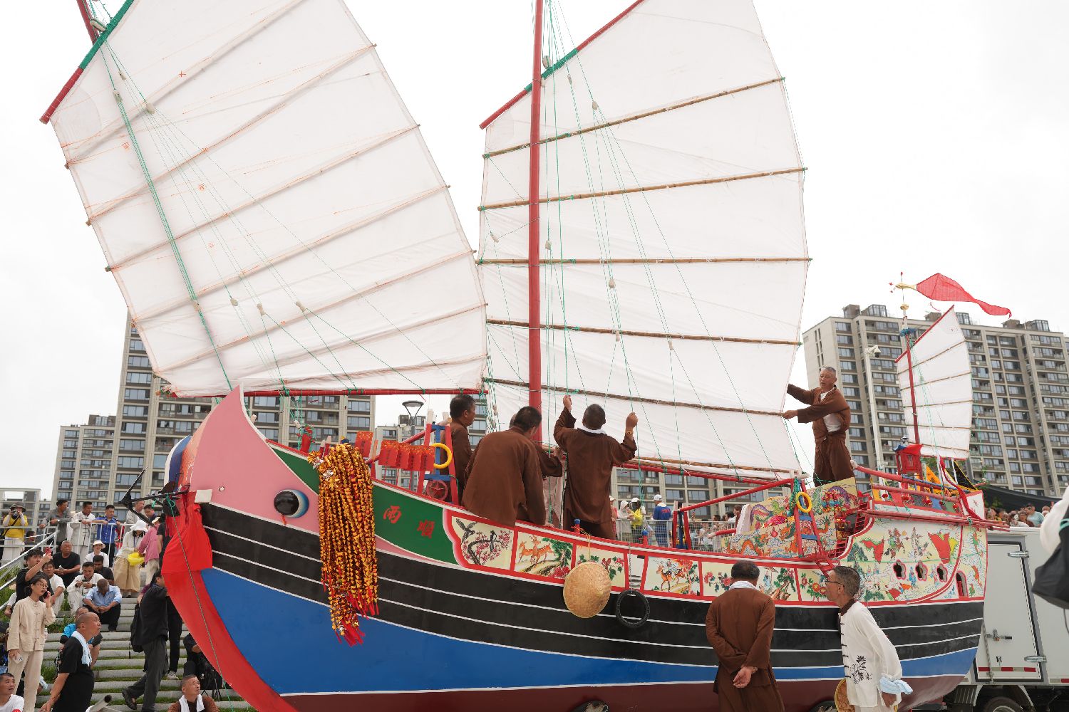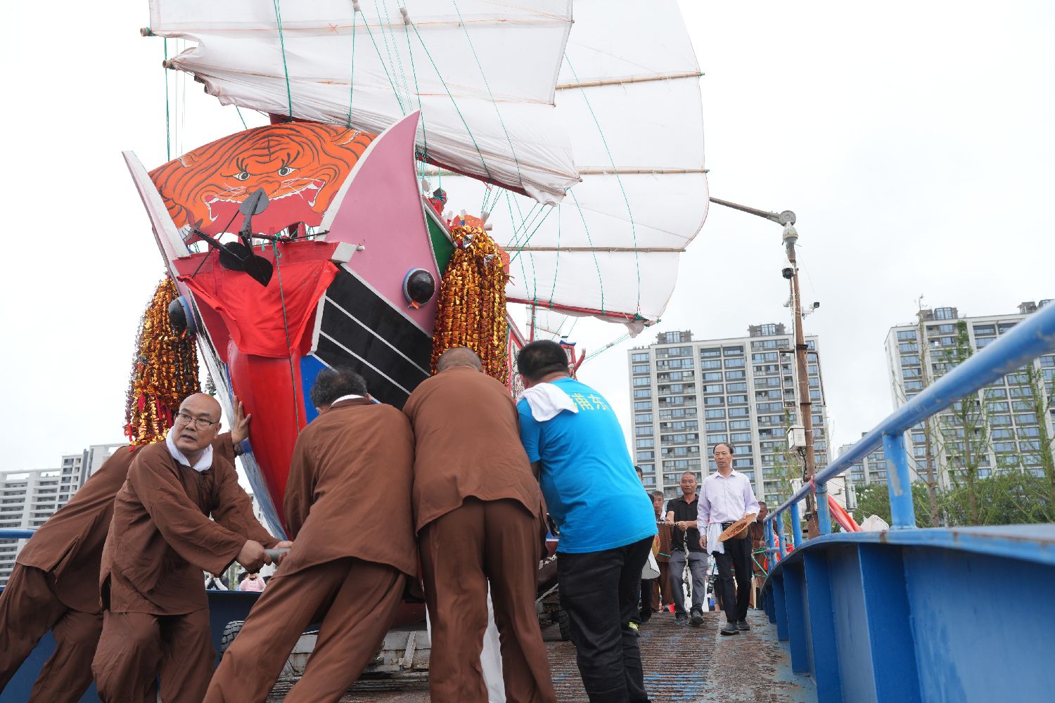 “大暑船”按三桅帆船样式建造,通身彩绘。人们抬着“大暑船”沿街巡游,随后推入江中由渔船牵引出海并点燃。“送大暑船”2021年被列入第五批国家级非物质文化遗产代表性项目名录。图为7月22日,当地民众给即将下水的“大暑船”张起船帆。(图片来源:本文图片均据新华社)