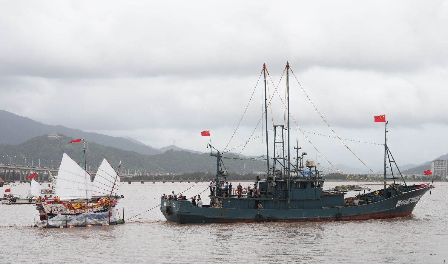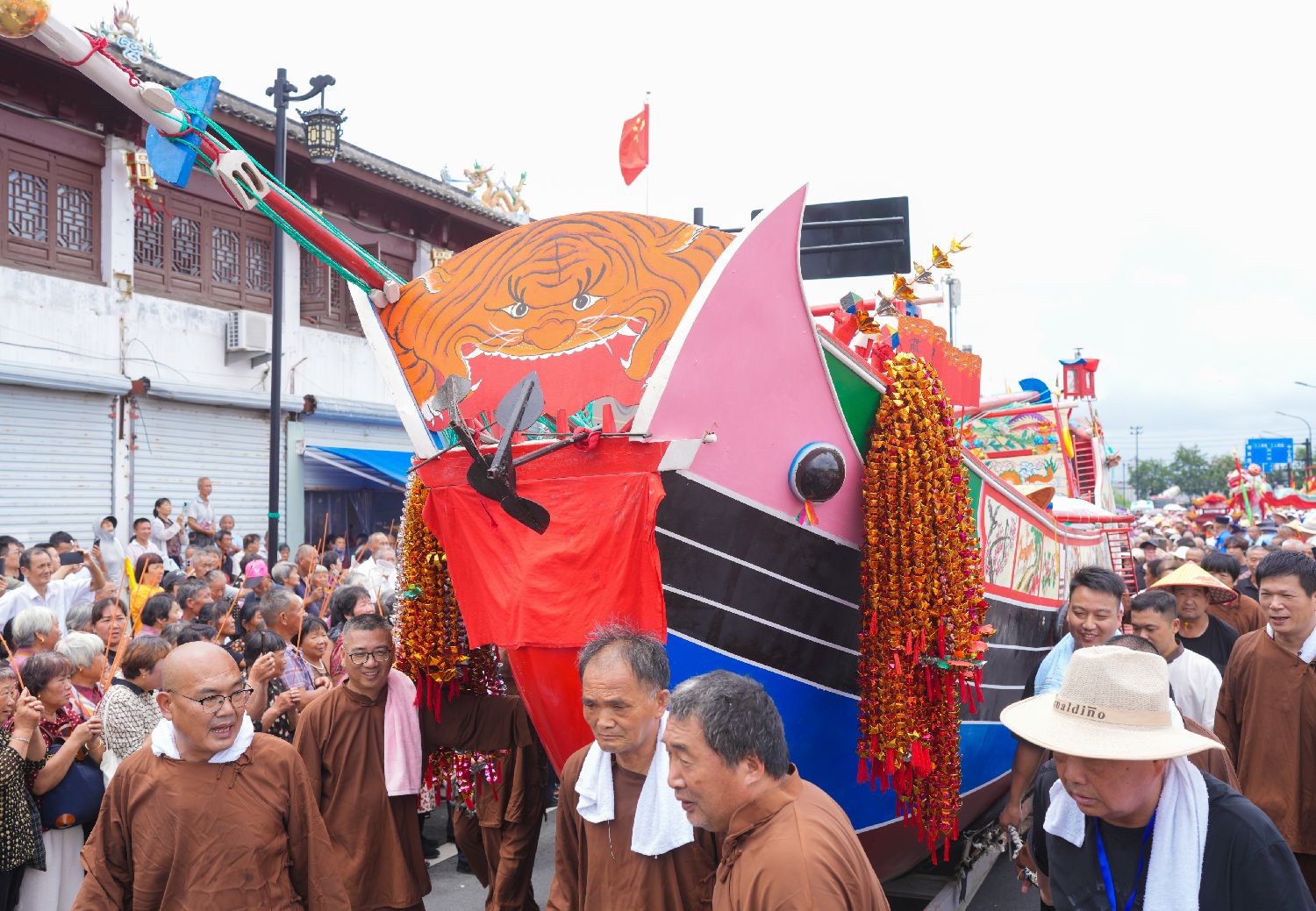 7月22日是大暑节气,浙江省台州市沿海群众在椒江区葭沚街道参加传统的“送大暑船”仪式。