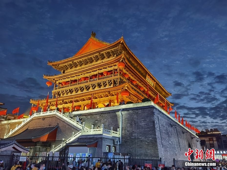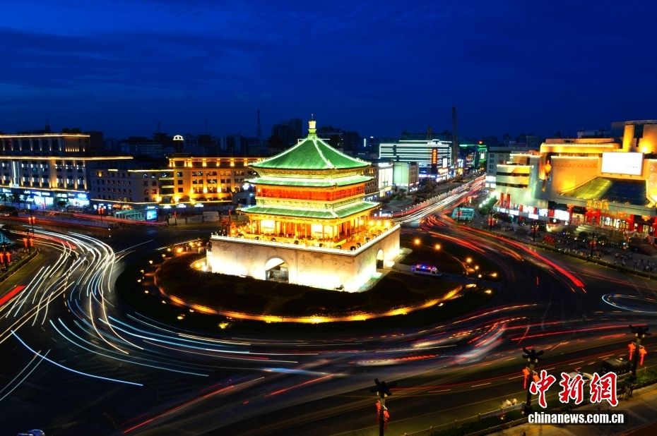 漫步在街头巷尾,西安的历史厚重感扑面而来。作为十三朝古都,西安拥有众多历史悠久的名胜古迹。西安钟楼、鼓楼,合称为钟鼓楼,均为中国古代的报时建筑。图为华灯初上,流光溢彩,钟楼仿佛一颗耀眼的明珠伫立在城市中。(图片来源:本文图片均来自中新网)