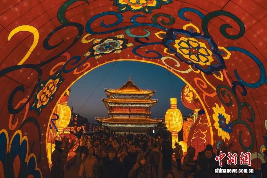 西安城墙是中国现存规模最大、保存最完整的古代城垣之一。登上西安城墙,古都的美景尽收眼底。图为西安春节城墙灯会现场,人流如织。