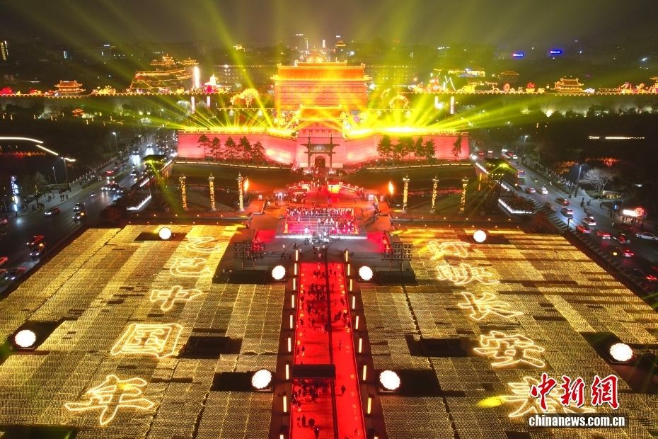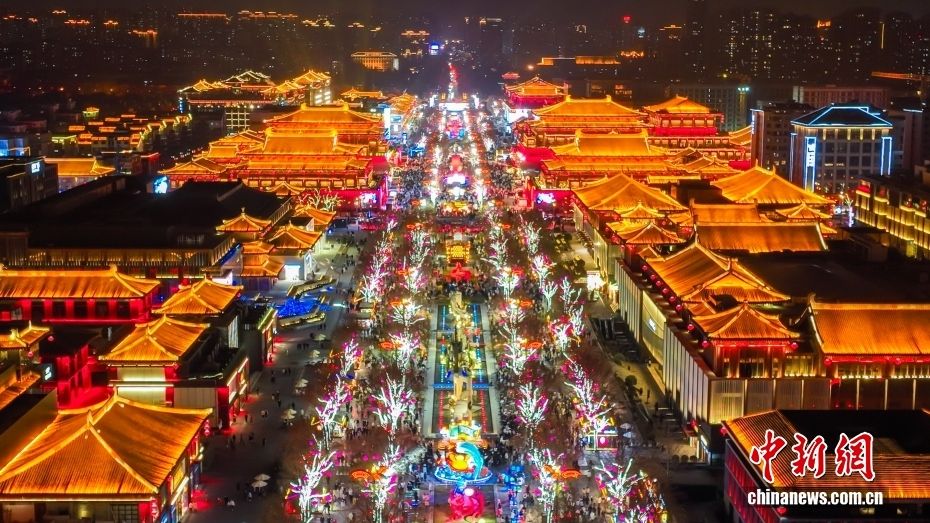 近年来,西安充分利用文化资源优势,持续打造多个再现中国古代盛唐时期的文化地标,形成传统与现代交织的“古都新韵”。图为陕西西安,航拍西安大唐不夜城夜景,灯火璀璨如白昼。