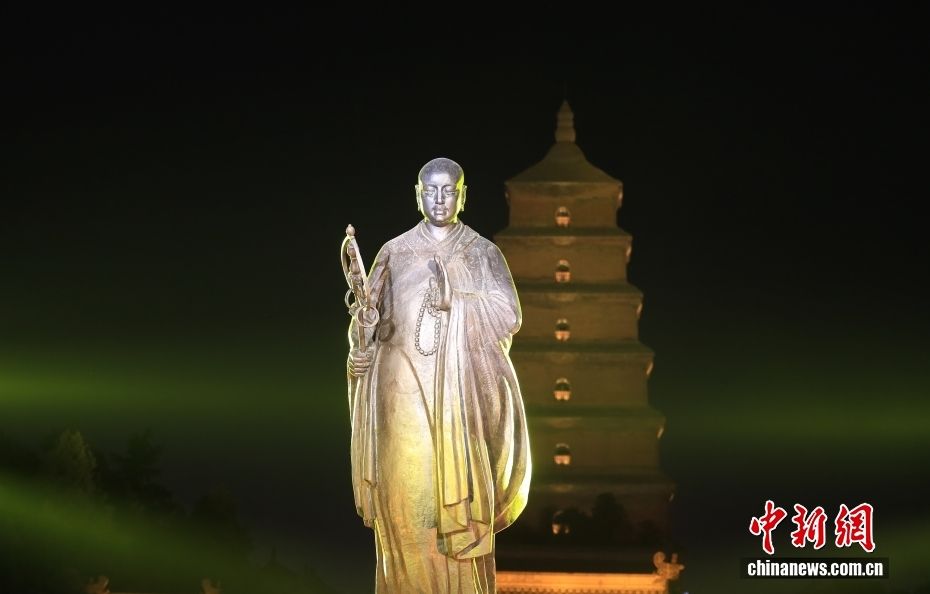 历经沧桑的大雁塔承载着盛唐时期的辉煌记忆。大雁塔又称大慈恩寺塔,始建于唐高宗永徽三年,是为保存玄奘法师经丝绸之路带回长安的经卷佛像而建,塔下碑文记述和佐证了大雁塔与丝绸之路佛教传播的历史。图为大雁塔前的僧人雕塑。