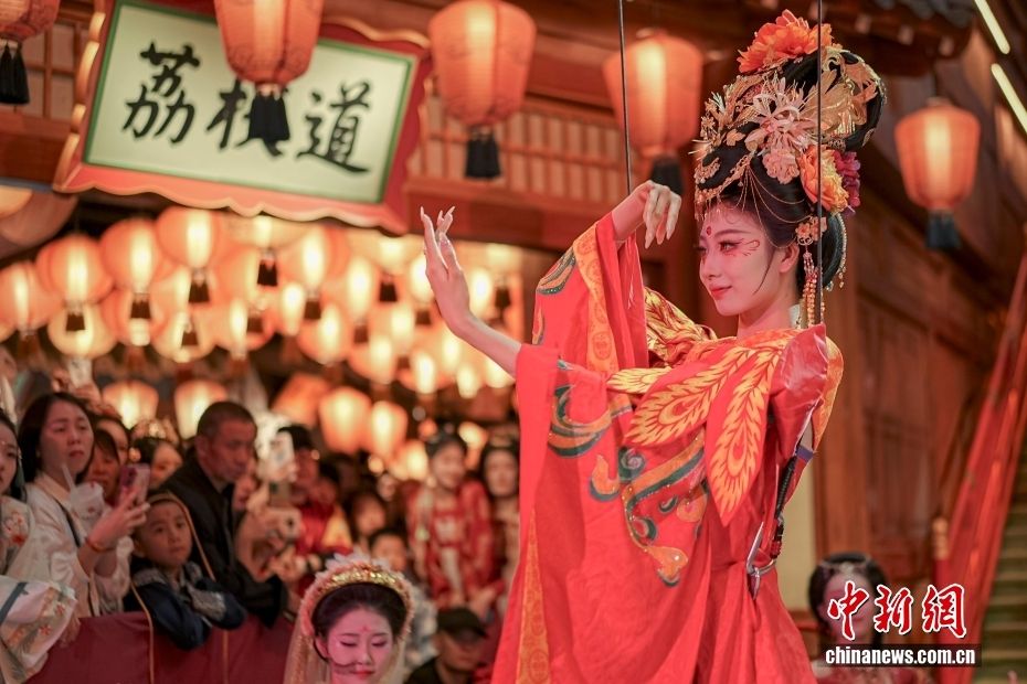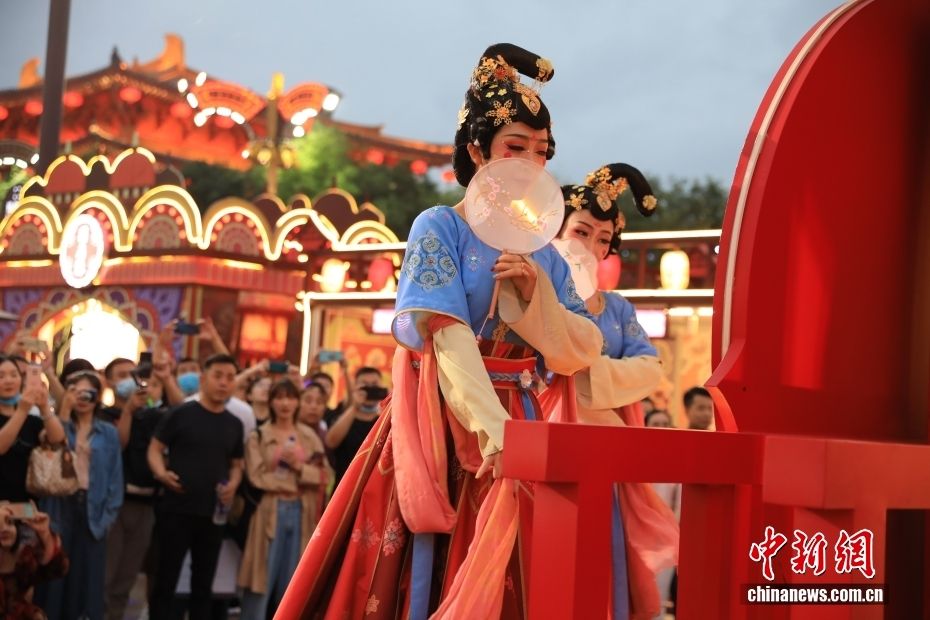 图为“长安十二时辰”街区内举行的主题活动吸引游客观看。