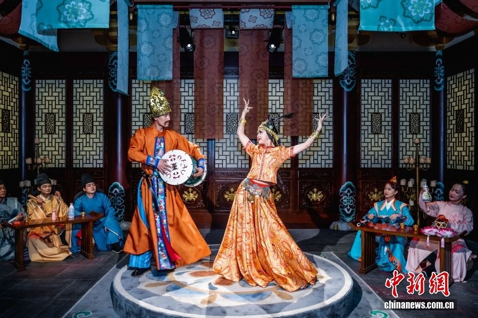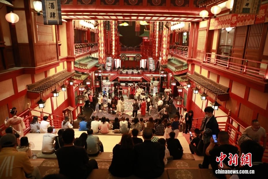 图为民众在“长安十二时辰”街区观看唐朝故事的情景剧,品尝美食,体验唐风市井生活。
