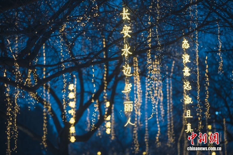 大雁塔东西两侧步行街的树枝上挂满了唐诗彩灯。