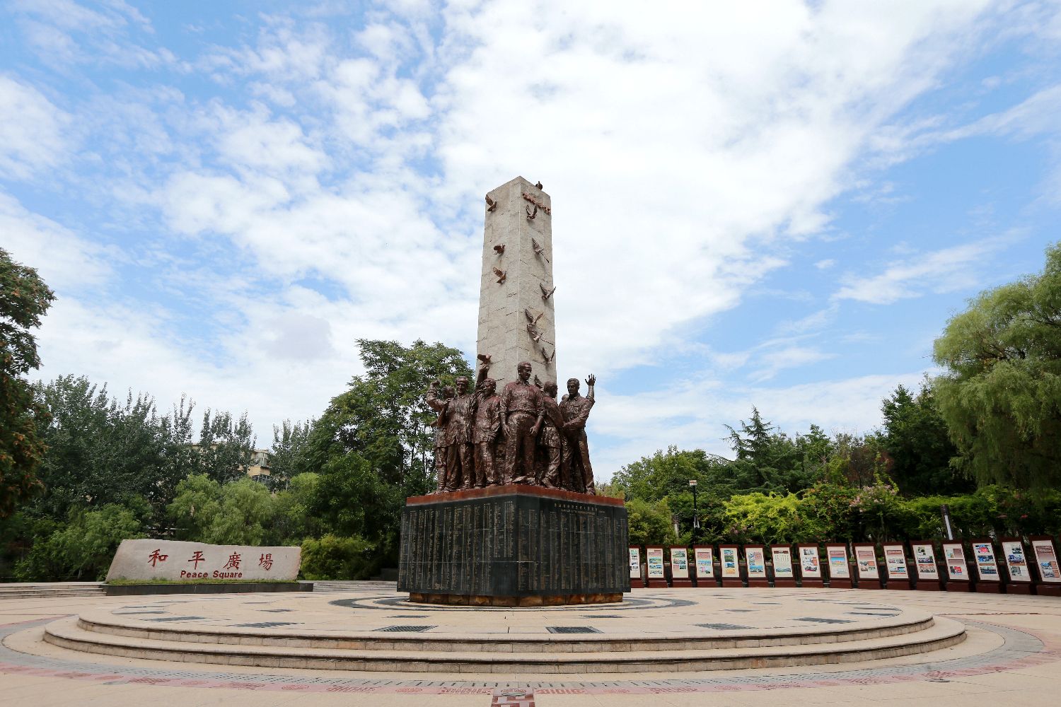 7月22日,在山东潍坊,潍县西方侨民集中营旧址旁的和平广场和纪念碑。