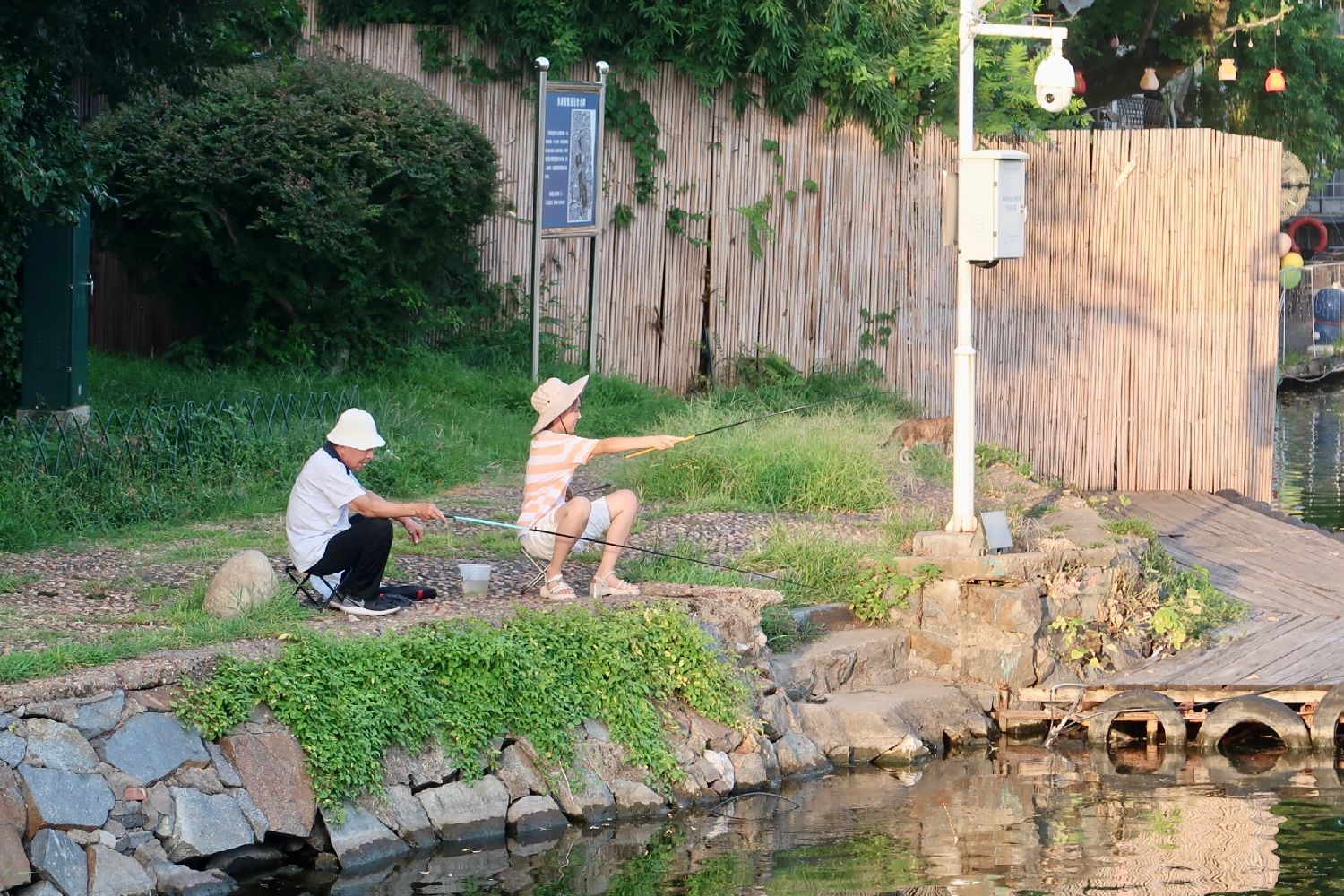 7月19日,江西省南昌市八一公园内,钓鱼爱好者持小鱼竿悠哉垂钓。(图片来源:中新社)