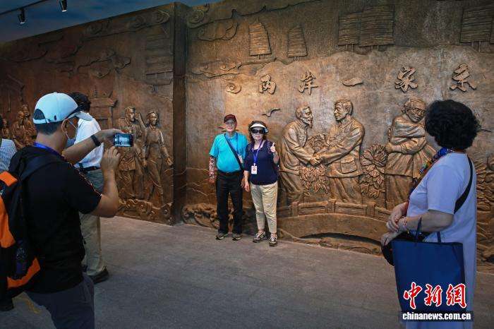 7月22日,台胞在“两岸一家亲”浮雕前合影。