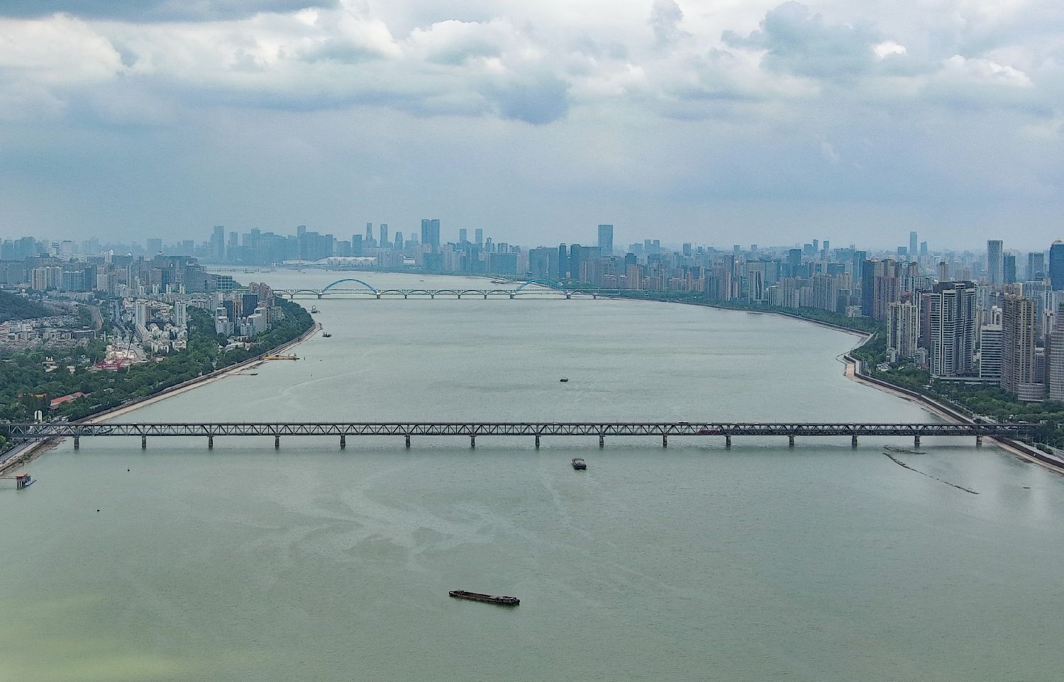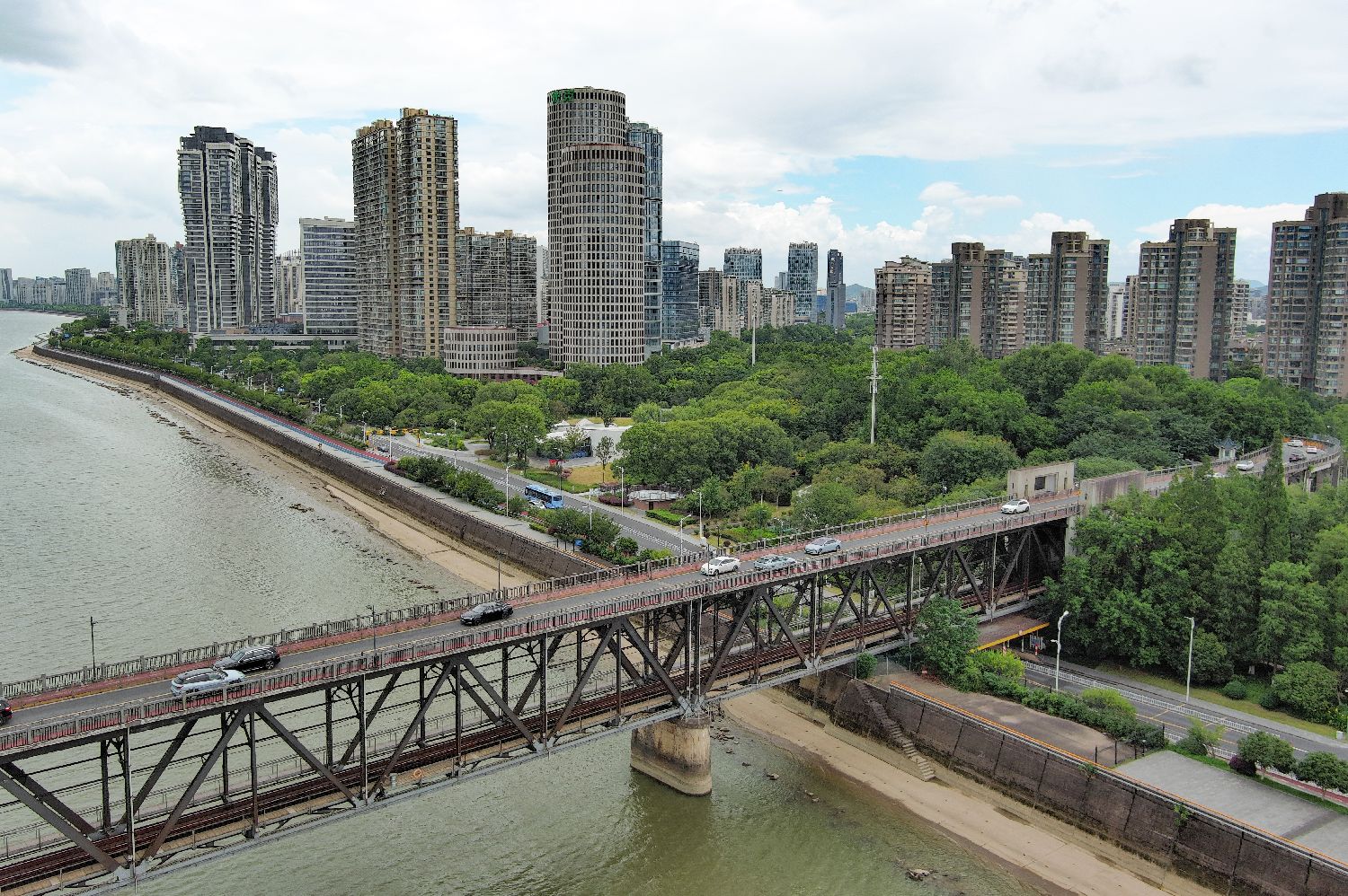 7月23日,从钱塘江大桥向南侧望去,“八十多岁”的钱塘江大桥之外,"三十多岁"的杭州高新区(滨江)已是高楼林立。