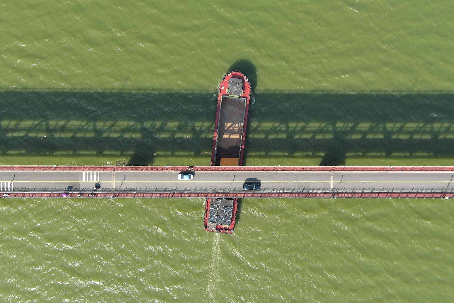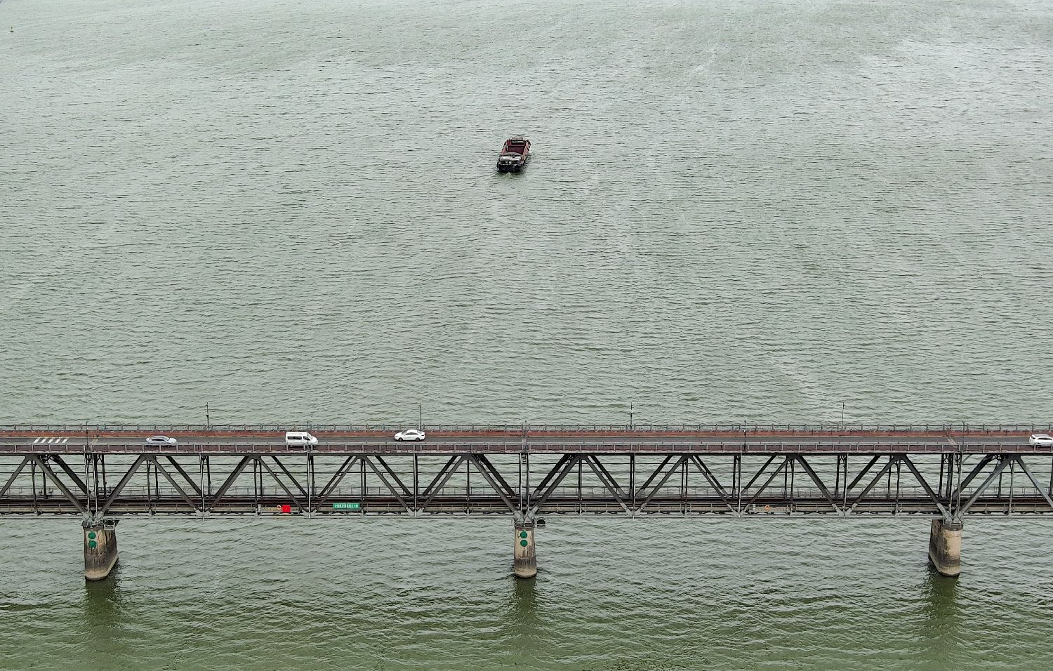 7月23日,汽车和轮船从钱塘江大桥上下通过。