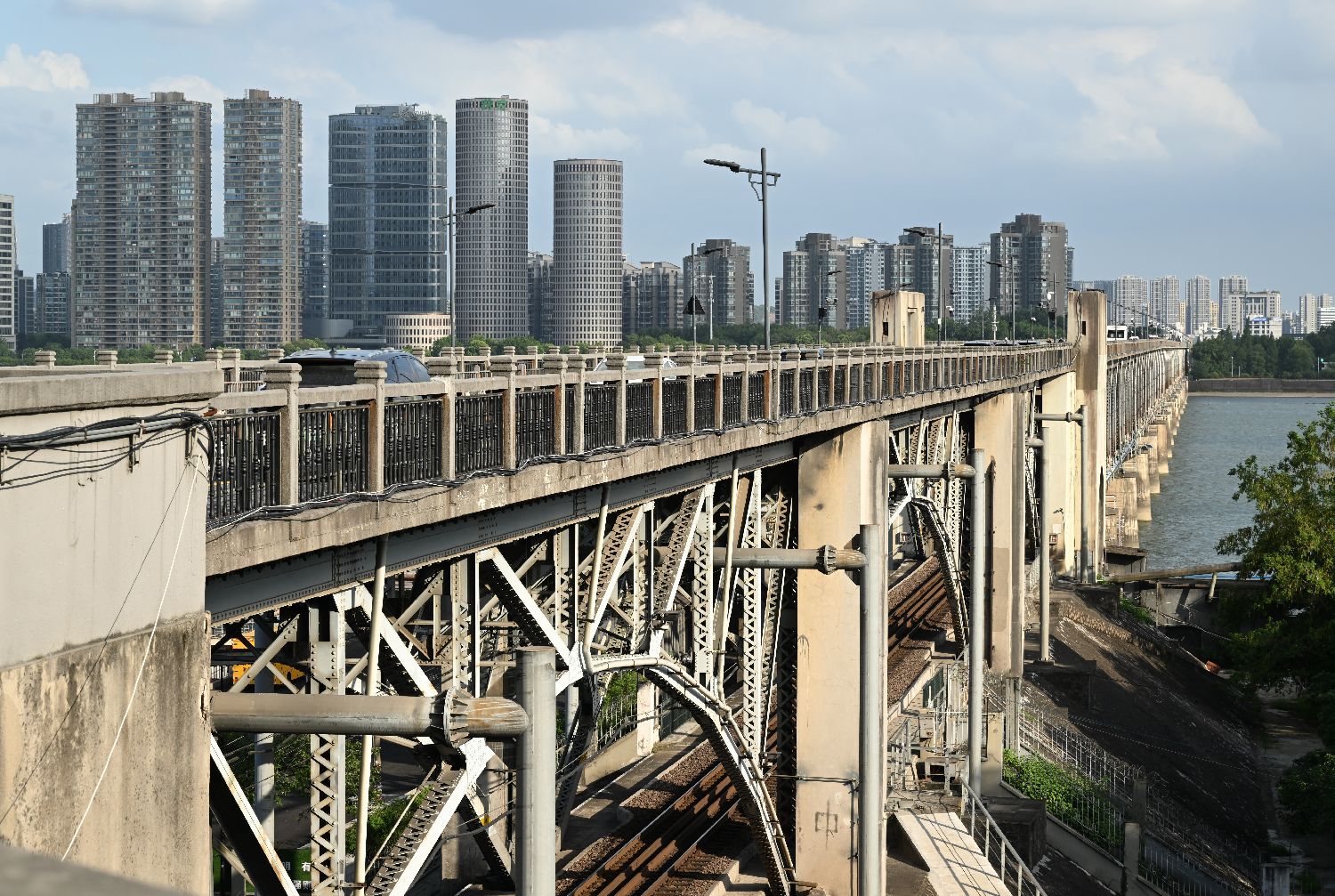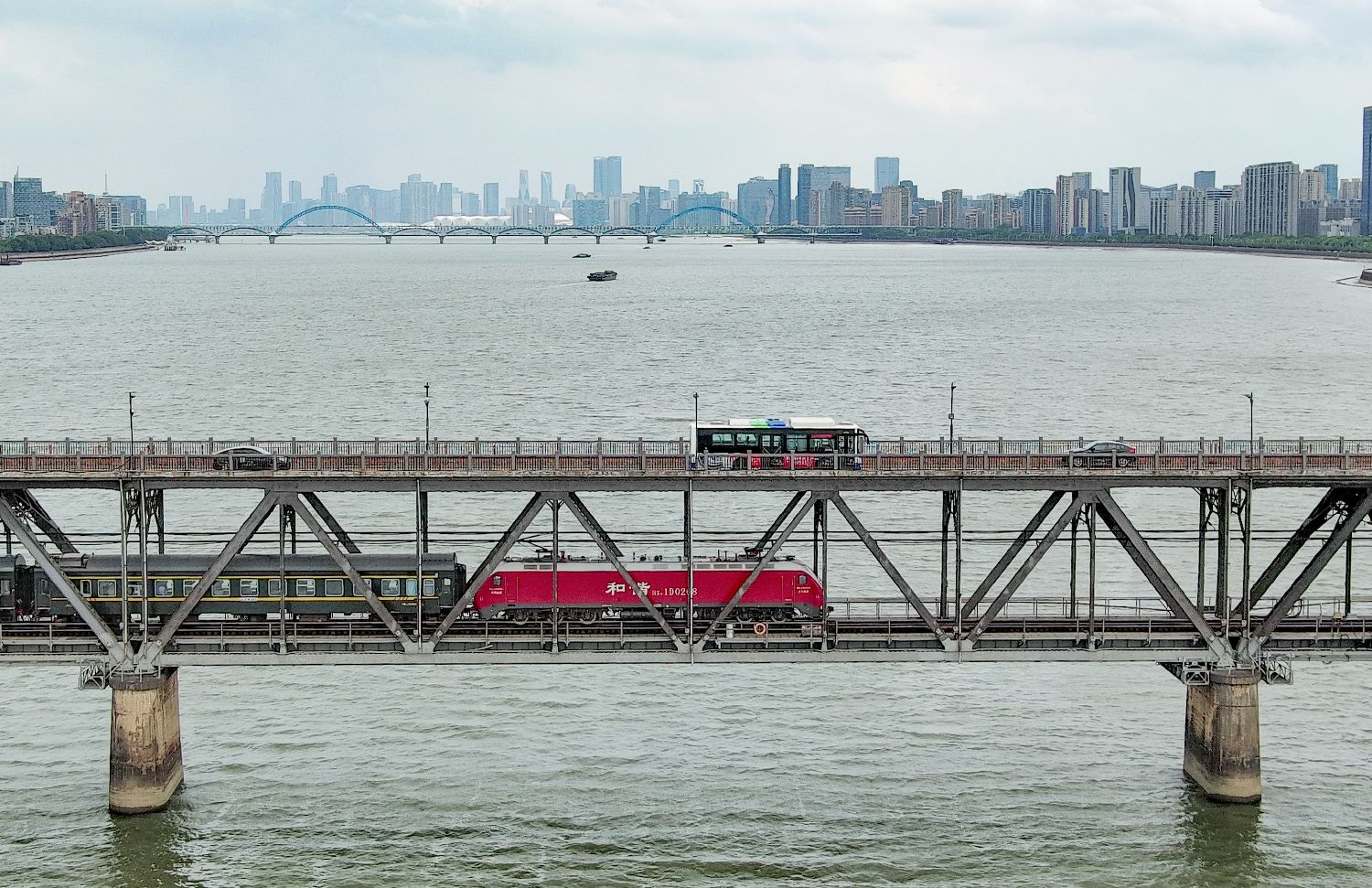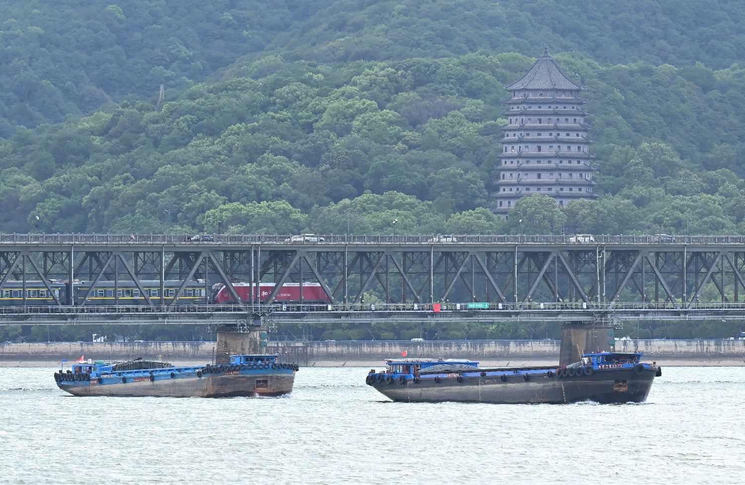 7月23日,千年六和塔下,钱塘江大桥交通繁忙,火车、轮船、汽车有序通行。