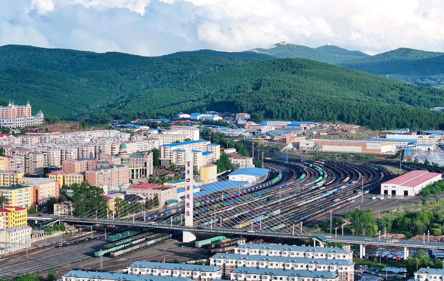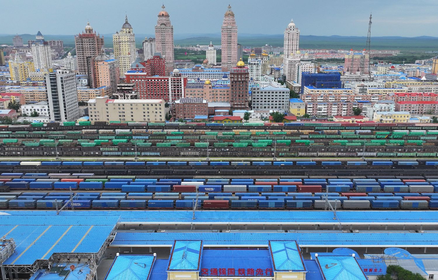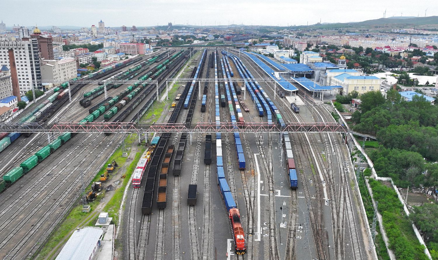 6月17日,中国铁路哈尔滨局集团有限公司绥芬河站南站场,满载货物的入境列车等待解体换装。