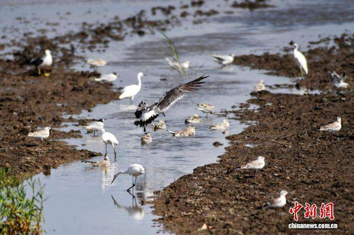 7月23日,黑嘴鸥及白鹭在滨海湿地共同栖息。(图片来源:中新网)